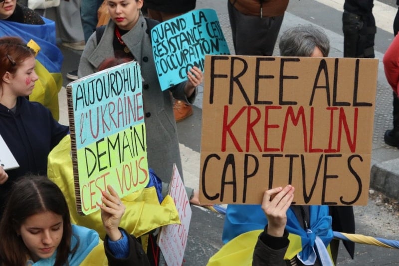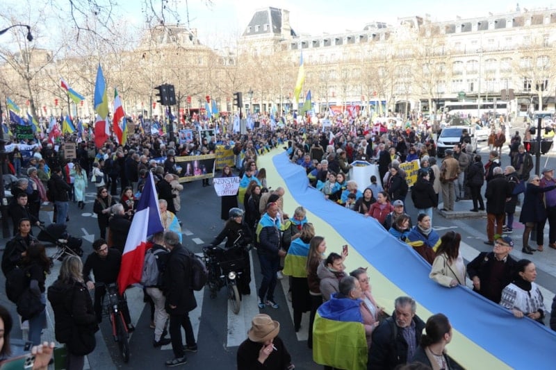 Göstericiler ayrıca Rusya Devlet Başkanı Vladimir Putin ve Rusya aleyhinde sloganlar attı. Ukrayna halkını desteklemek ve özgürlüğü savunmak amacıyla düzenlenen yürüyüşe, Fransız sivil toplum kuruluşları da destek verdi.
