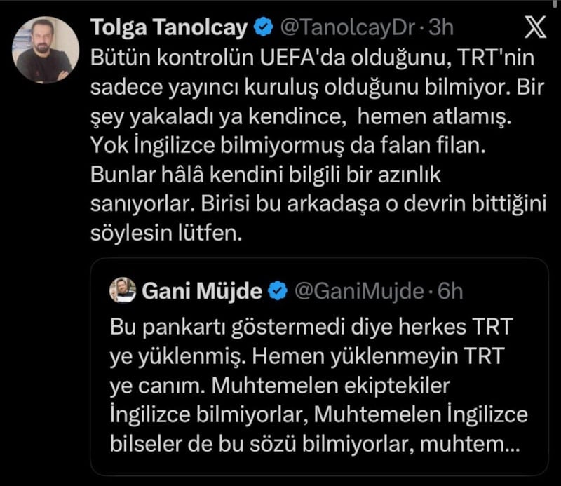 “Bütün kontrolün UEFA’da olduğunu, TRT’nin sadece yayıncı kuruluş olduğunu bilmiyor. Bir şey yakaladı ya kendince, hemen atlamış. Yok İngilizce bilmiyormuş da falan filan. Bunlar hala kendini bilgili bir azınlık sanıyorlar. Birisi bu arkadaşa o devrin bittiğini söylesin lütfen.”