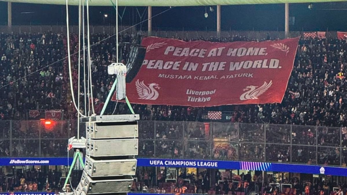 Liverpool taraftarlarları, Mustafa Kemal Atatürk’ün “Yurtta sulh, cihanda sulh” sözünü İngilizce olarak yazılı pankart açtı.