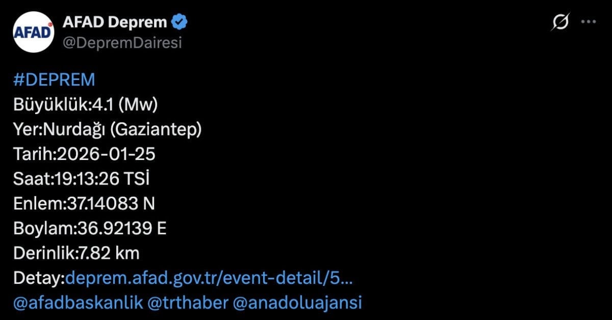 AFAD’dan yapılan açıklamaya göre Nurdağı ilçesinde 4.1 büyüklüğünde deprem meydana geldi.