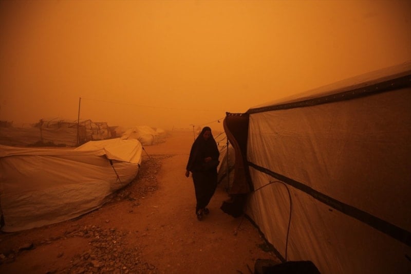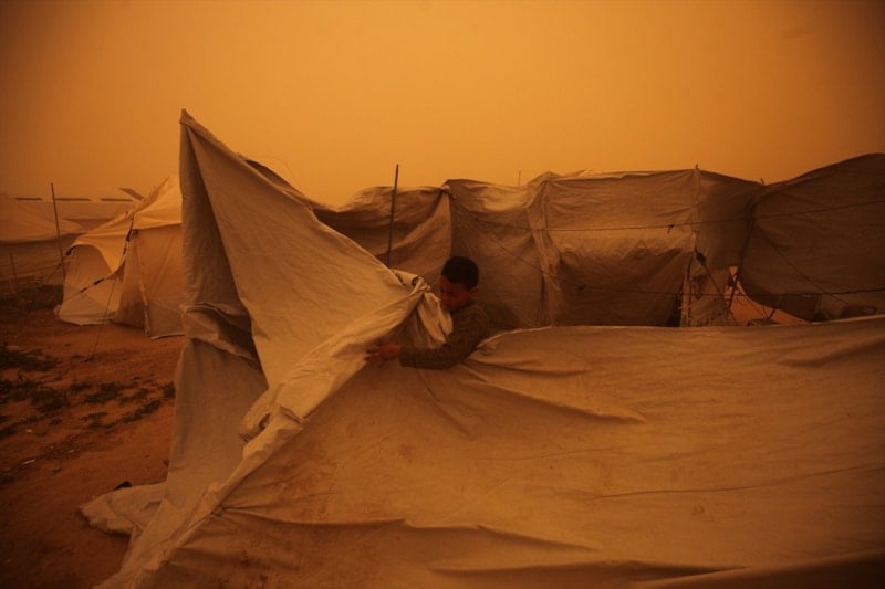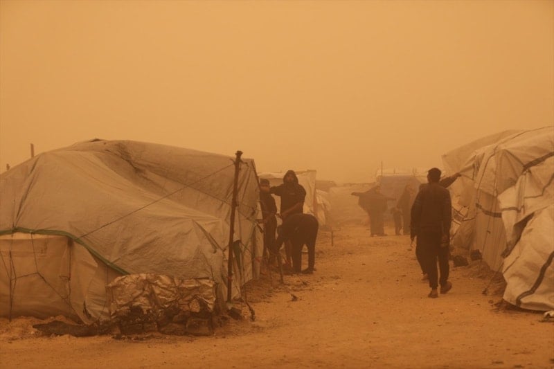 Etkili olan şiddetli rüzgar ve olumsuz hava koşulları kum fırtınasına neden olurken çok sayıda çadır hasar görme noktasına geldi.