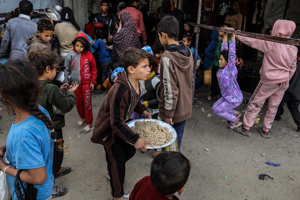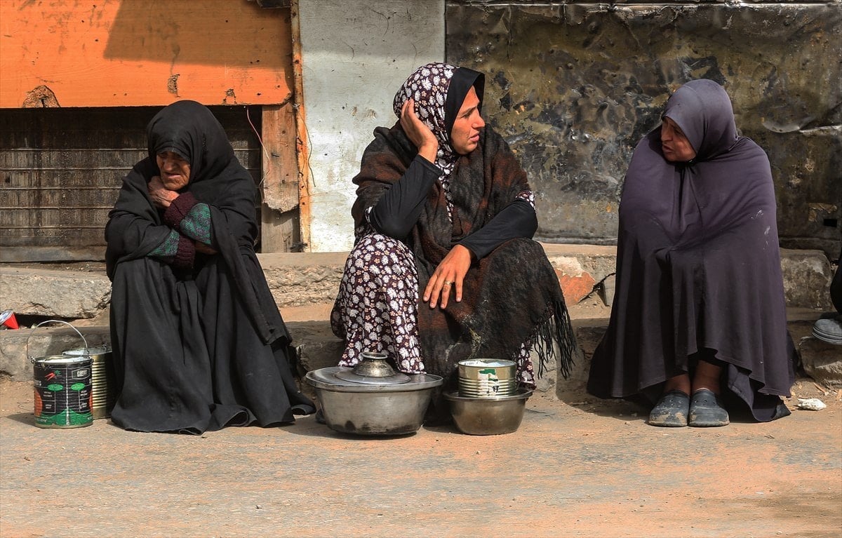 Yemekten almak isteyen ve aralarında çocukların da bulunduğu çok sayıda Filistinli, bir kap yemeğe ulaşabilmek için soğuk havaya rağmen yoğunluk oluşturdu.