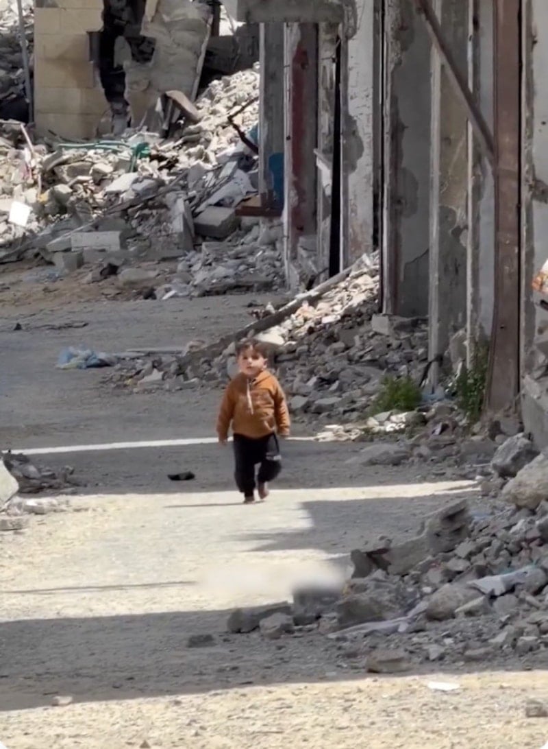 Kentte yıkılmış binaların molozların arasında yalın ayak yürüyen küçük erkek çocuğu, sosyal medyada gündem oldu.