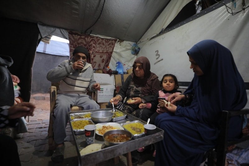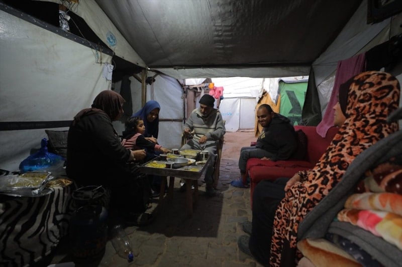 Gazze Şeridi’nin orta kesiminde yer alan Bureyc Kampı’nda bölgesinde yaşayan Mohammed Abu Eida ailesiyle birlikte iftarını İsrail saldırılarında yıkılan evlerinin enkazı arasındaki çadırda yaptı.