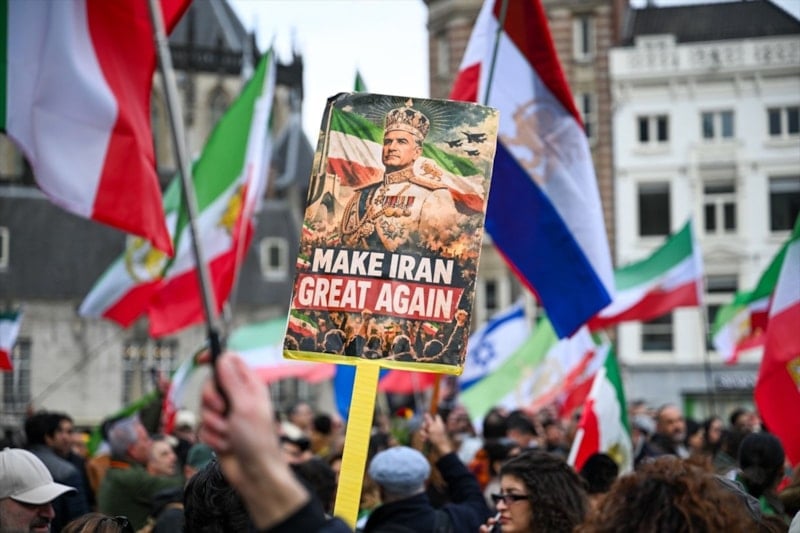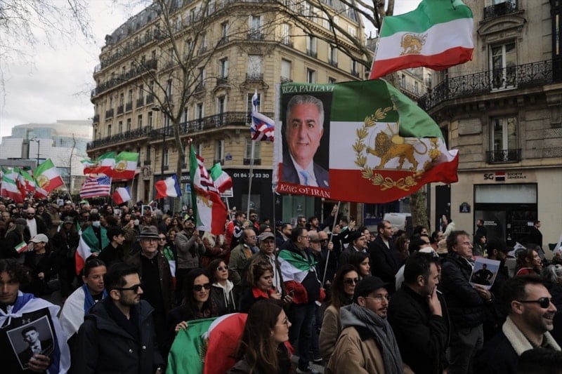 Protestocuların ellerinde İran Şahı Muhammed Rıza Pehlevi’nin ve oğlu Rıza Pehlevi’nin posterleri dikkat çekti.
