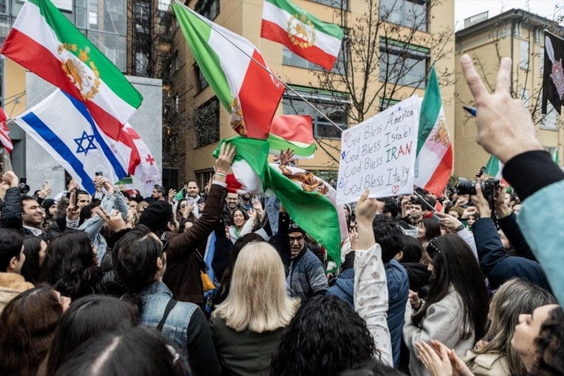 İran hükümetini protesto etmek amacıyla İran Başkonsolosluğu önünde bir araya gelen yüzlerce kişi, Milano’da bayraklar sallayıp sloganlar attı.