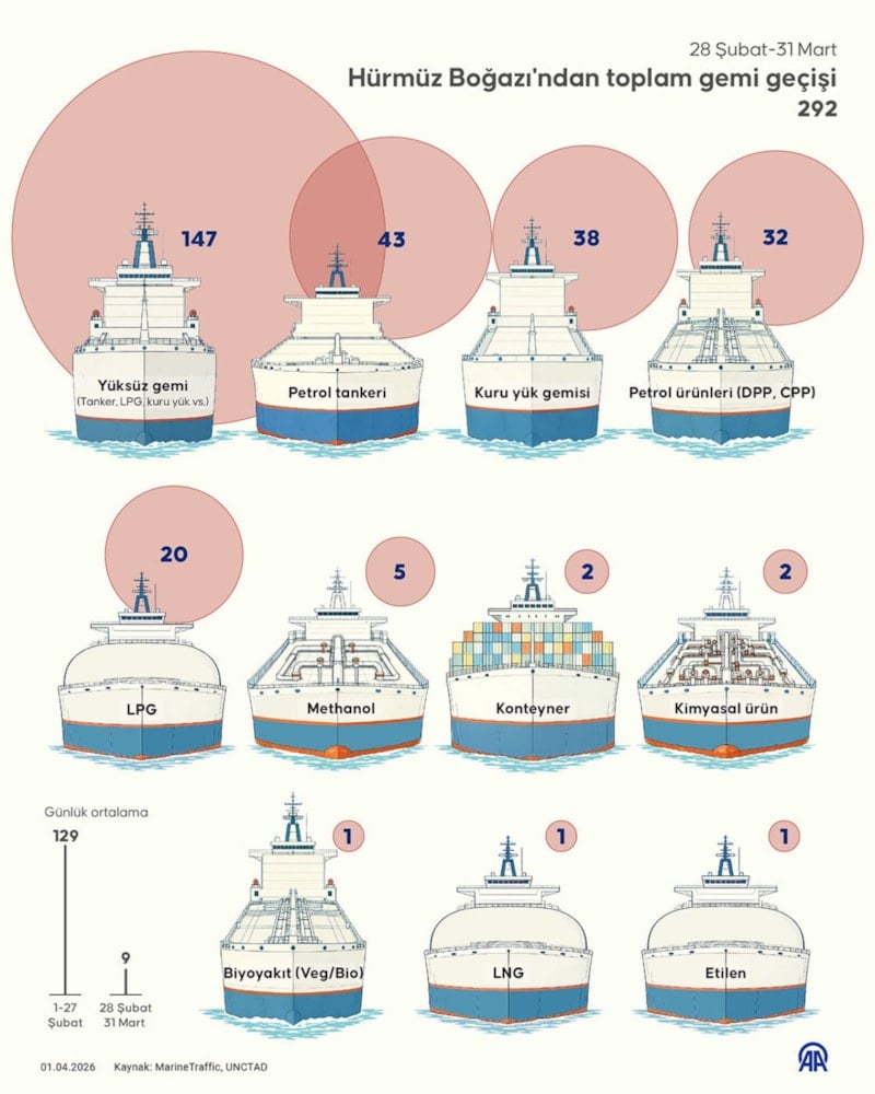 Hürmüz Boğazı’nı 28 Şubat-31 Mart arasında geçen 292 ticari geminin, 147’sinin boş olduğu görüldü.
