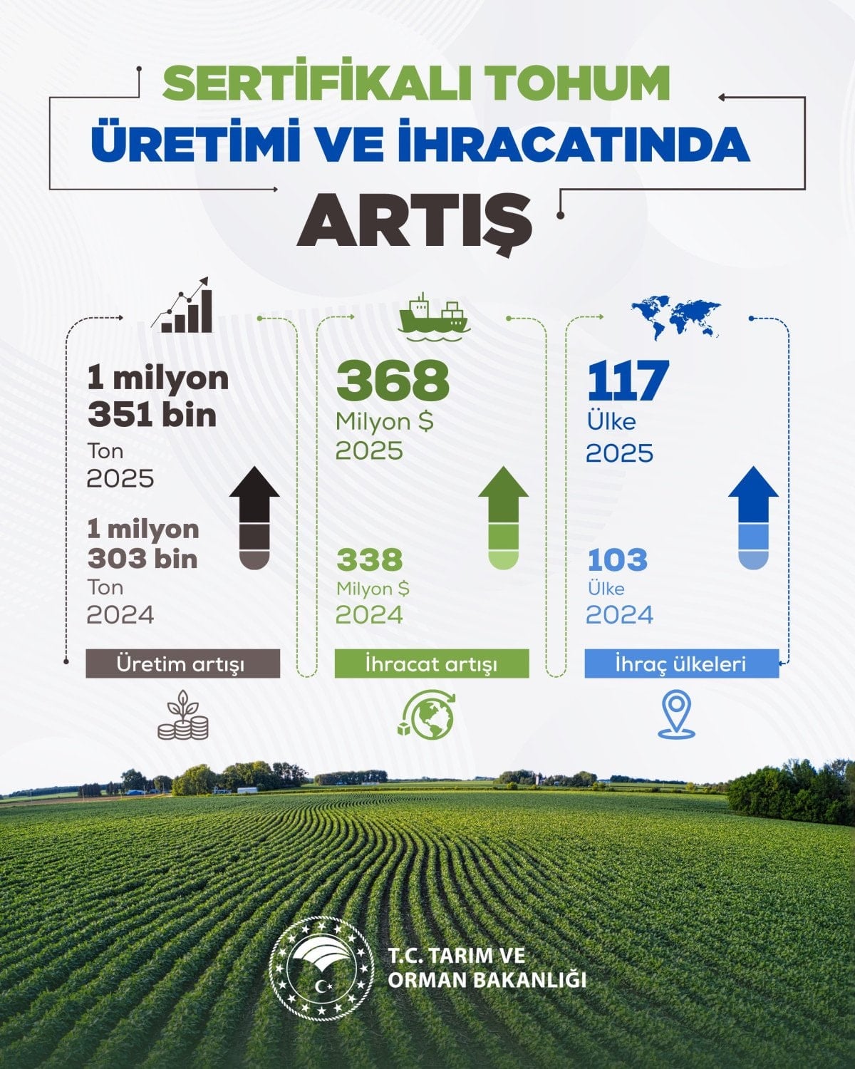 “2025 yılı itibarıyla, 1 milyon 351 bin ton üretime ulaştık, 368 milyon dolar ihracat gerçekleştirdik, 117 ülkeye tohum ihraç ediyoruz. Tohumda yerli ve milli gücümüzü artırıyor, Türkiye’yi küresel ölçekte daha güçlü bir konuma taşıyoruz.”