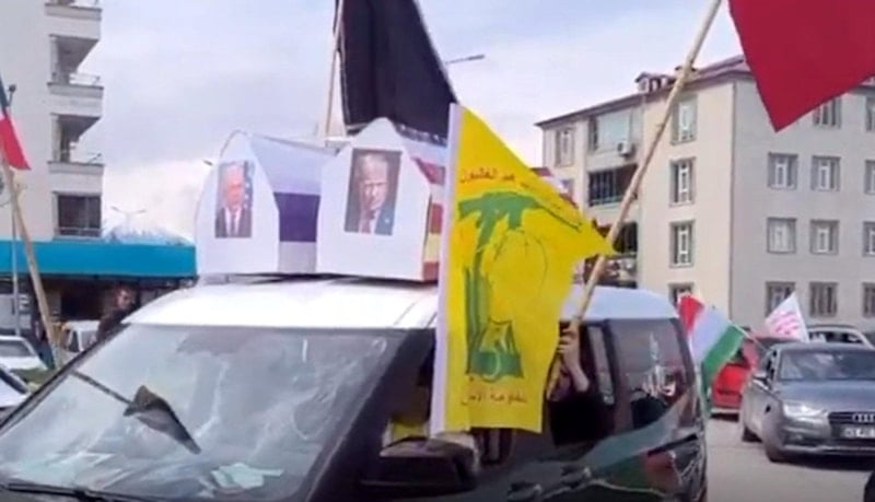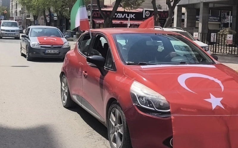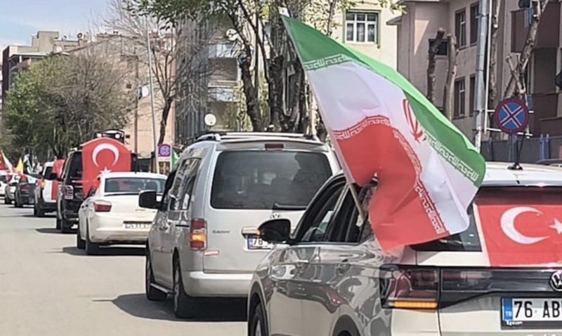 Türk, İran, Azerbaycan ve Filistin bayraklarıyla donatılan araçlar, şehir merkezinde sloganlar eşliğinde tur attı.