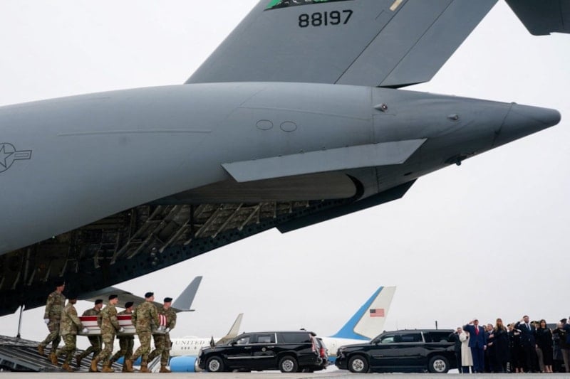 Trump ve diğer katılımcılar, tek tek uçaktan indirilerek araçlara taşınan cenazeleri asker selamı ile karşılarken, törende herhangi bir konuşma yapılmadı.