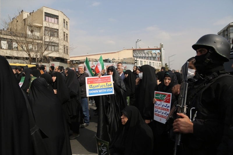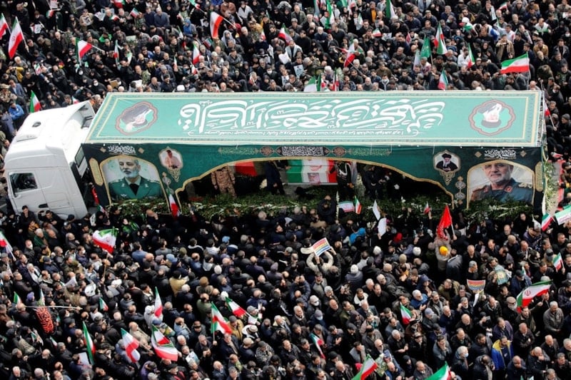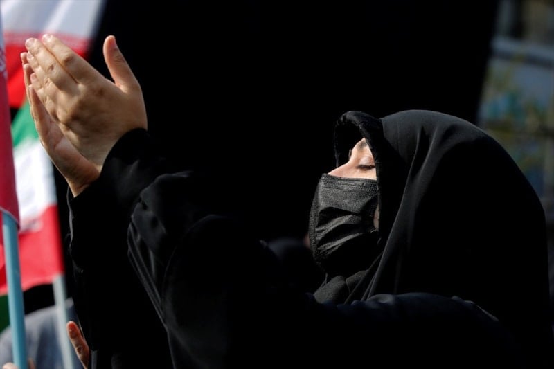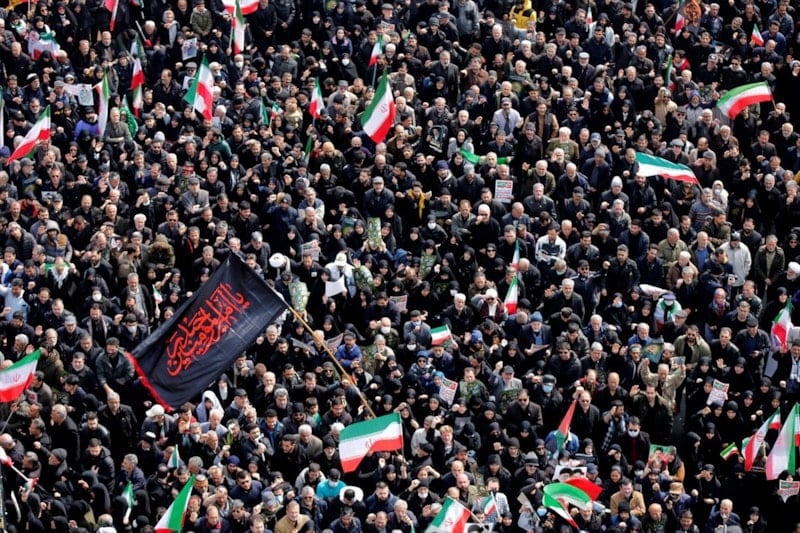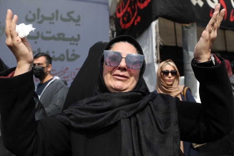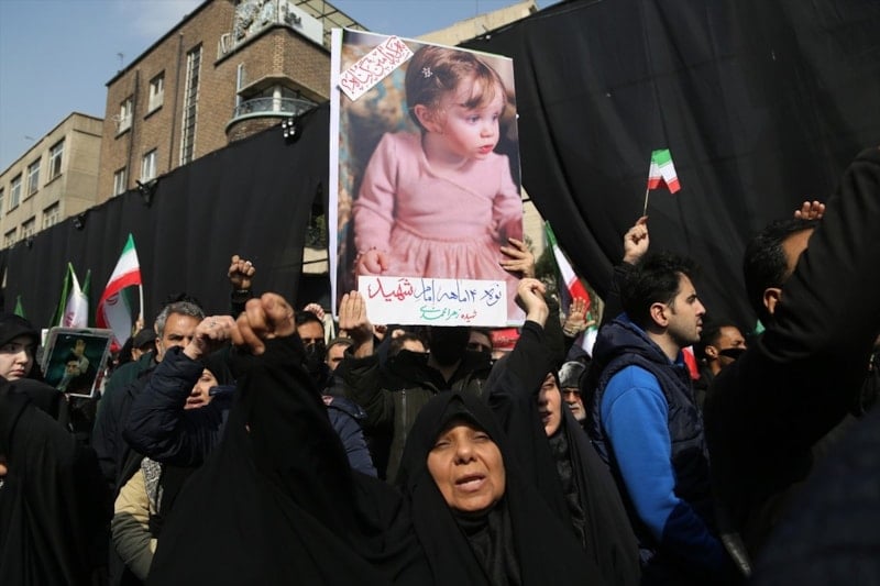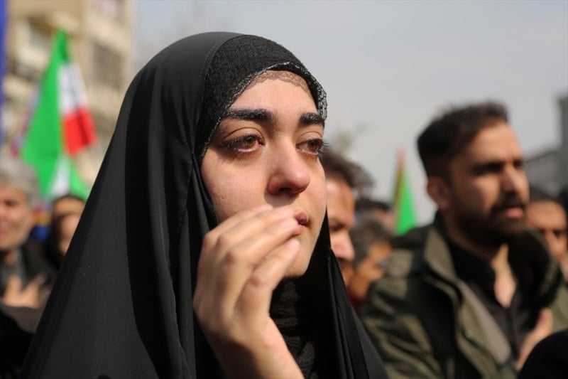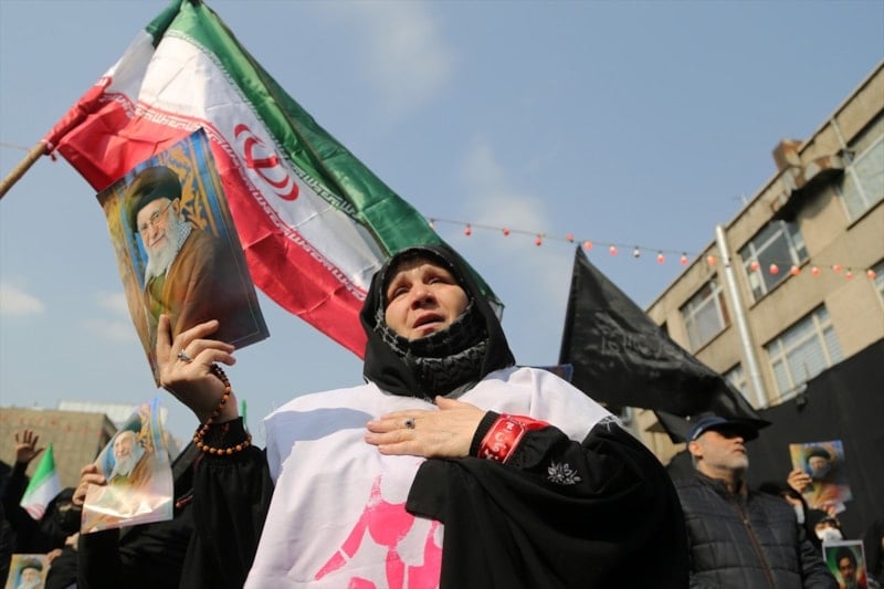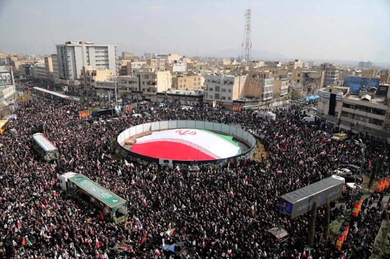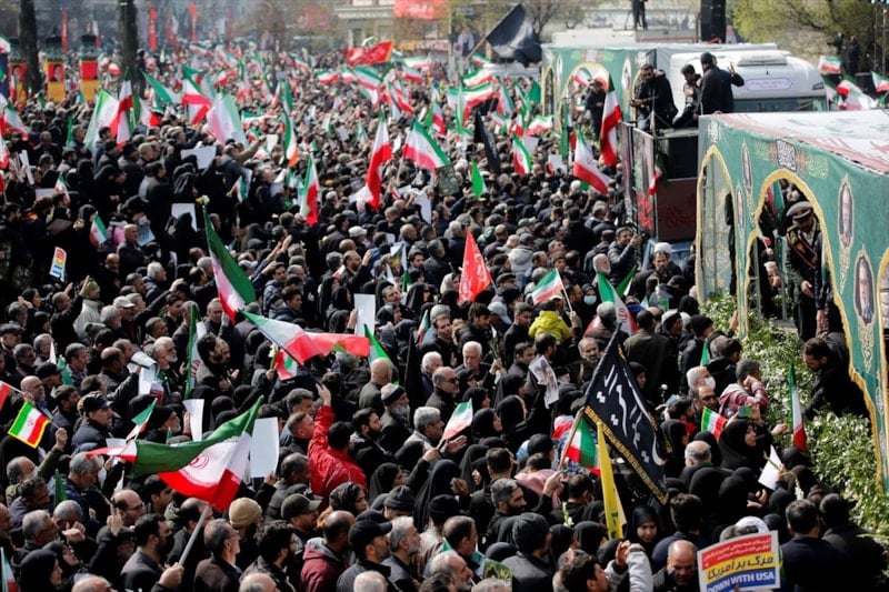 Cenaze törenini gözyaşları içerisinde takip eden halk burada, ABD, İsrail ve İngiltere aleyhine sloganlar atarak cenaze konvoyuna eşlik etti.