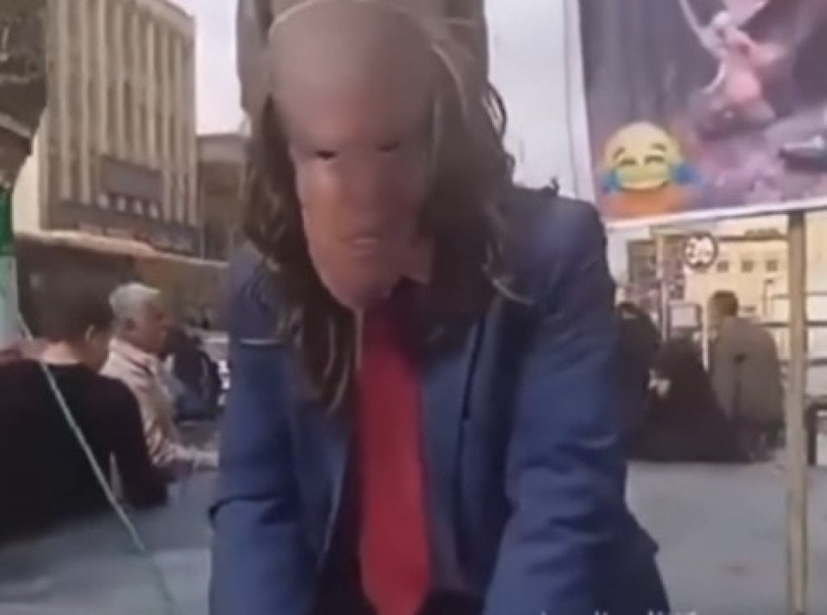 İran’da kamuya açık bir alanda gerçekleştirilen gösteride, ABD Başkanı Donald Trump’ı temsil ettiği belirtilen bir figür üzerinden sembolik bir sahne canlandırıldı.