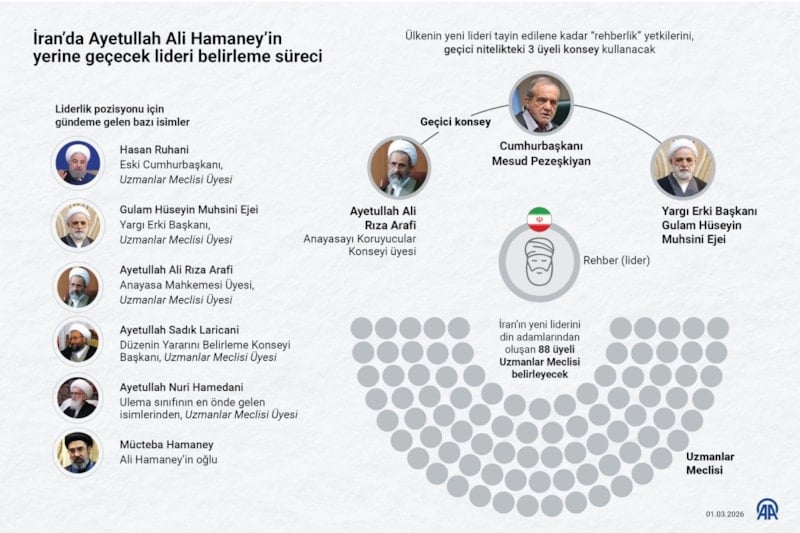 İran Anayasası’nın 107. maddesine göre, 88 üyeden oluşan ve halk tarafından sekiz yıllığına seçilen Uzmanlar Meclisi, liderin ölümü veya görev yapamaz hale gelmesi durumunda yeni lideri seçmekle yükümlü. Üyeler üst düzey din adamlarından oluşuyor.