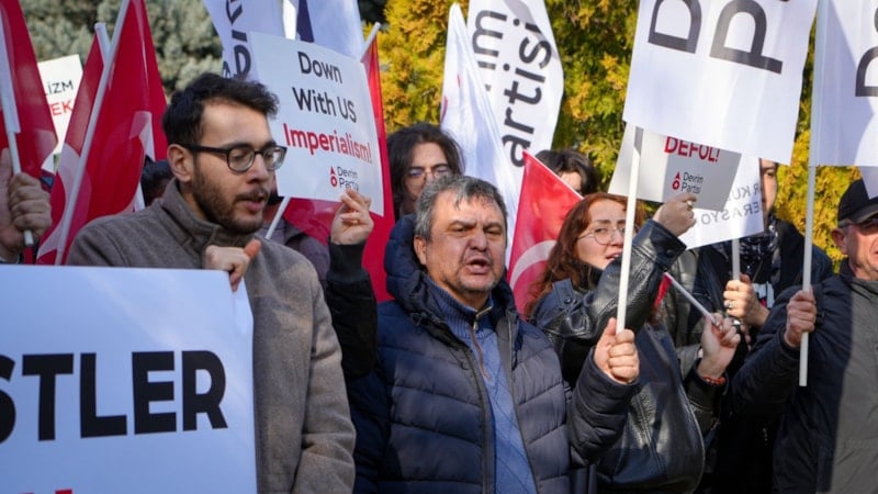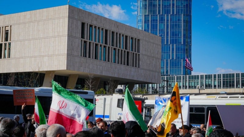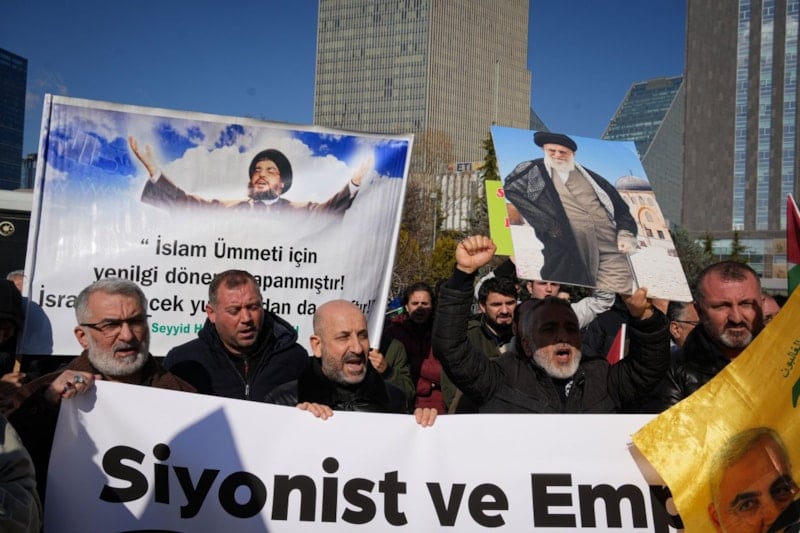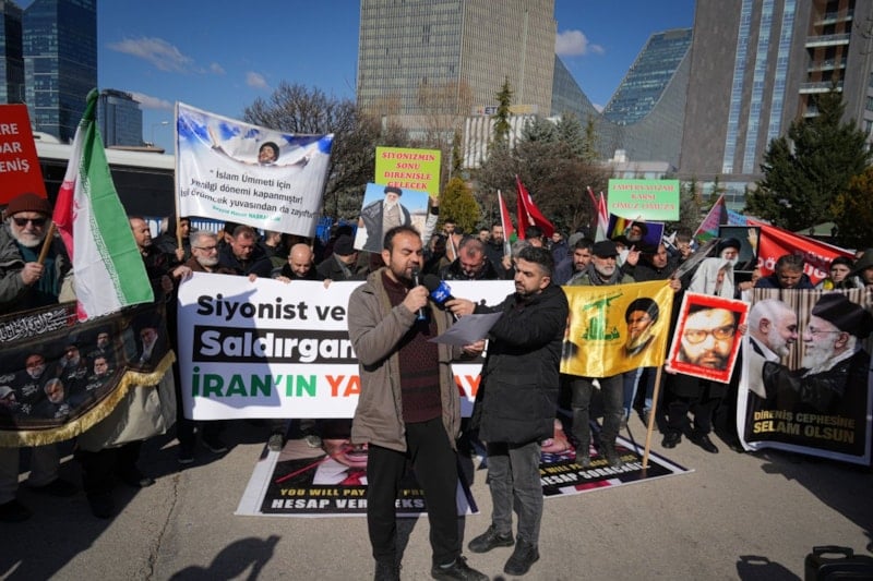 ABD’nin Ankara Büyükelçiliği önünde toplanan kalabalık, İran bayrakları ve Hamaney’in fotoğraflarını taşıdı. Göstericiler, ellerindeki dövizlerde “İslam’ın ve Müslümanların asıl düşmanı emperyalizm ve siyonizmdir” ile “Amerika’nın özgürlük ve demokrasisi katliamdır” yazılı pankartlar bulundurdu.