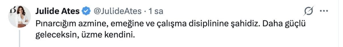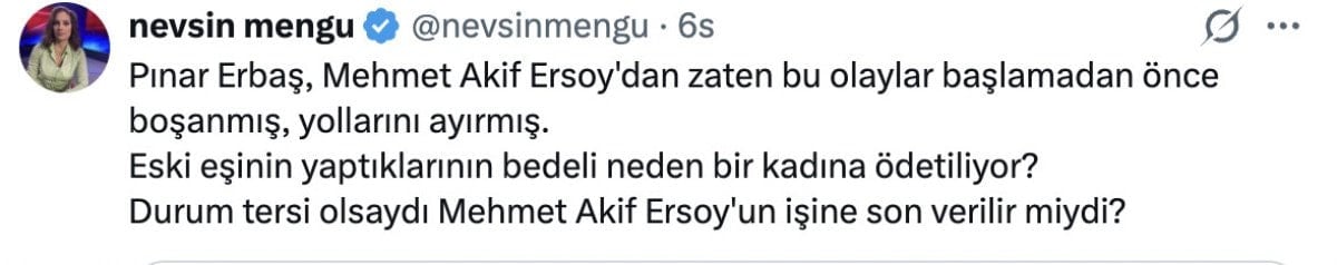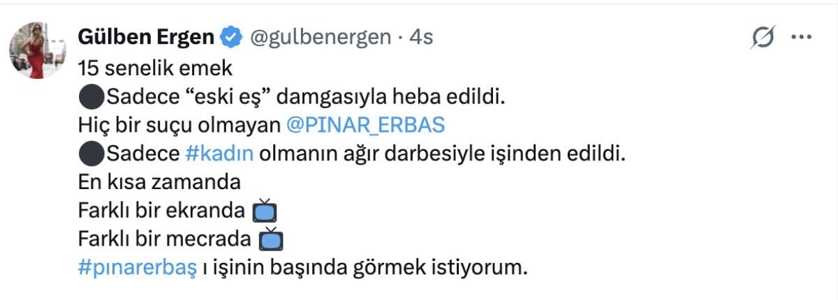 Gülben Ergen de, “15 senelik emek Sadece “eski eş” damgasıyla heba edildi. Hiç bir suçu olmayan Pınar Erbaş. Sadece kadın olmanın ağır darbesiyle işinden edildi. En kısa zamanda farklı bir ekranda, farklı bir mecrada Pınar Erbaş’ı işinin başında görmek istiyorum.” dedi.