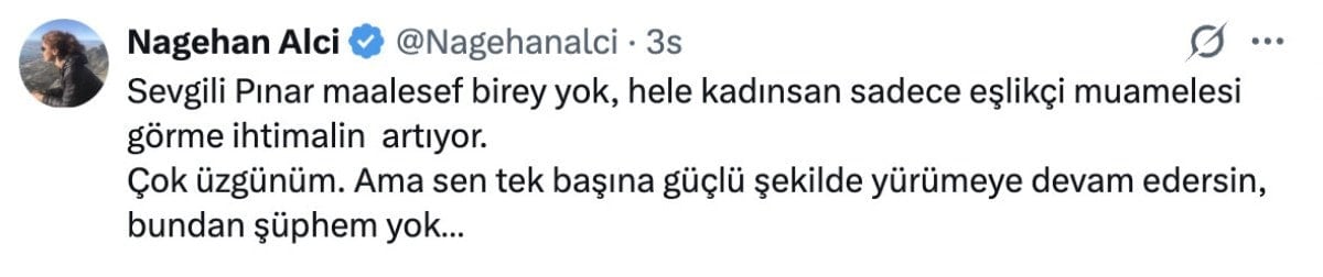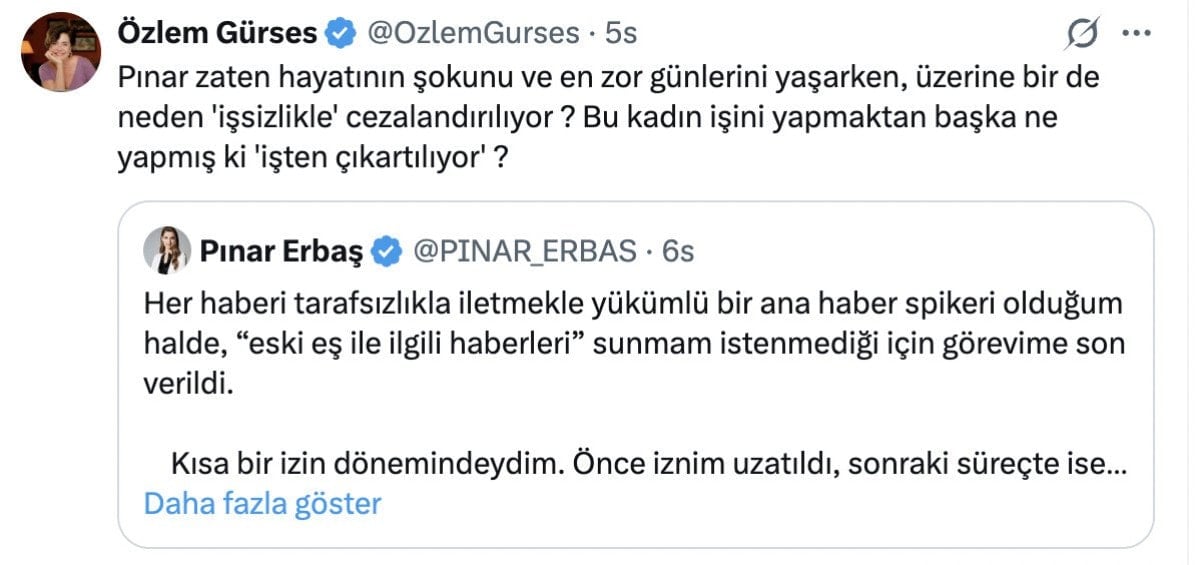 Pınar Erbaş, işine son verildiğini X hesabı üzerinden paylaşması ve kırgın olduğunu yazması üzerine de bazı isimlerden destek mesajları geldi.
