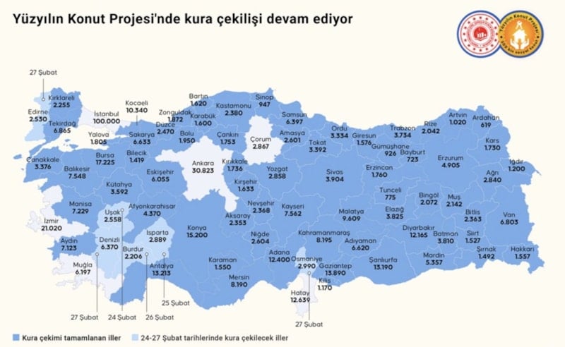 Bu hafta, Uşak’ta 2 bin 558, Isparta’da 2 bin 889, Burdur’da 2 bin 206, Edirne’de 2 bin 530, Denizli’de 6 bin 370 ve Osmaniye’de 2 bin 990 konutun daha hak sahipleri belli olacak.