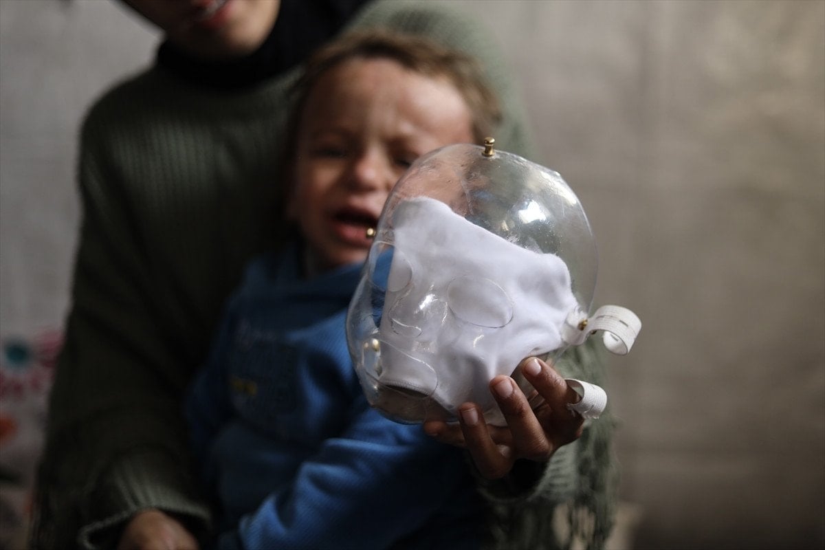 Doktorlar, yanıklara bağlı olarak yüz dokusunun kontrolsüz şekilde genişlemesini önlemek amacıyla çocuğa plastik basınç maskesi taktı.