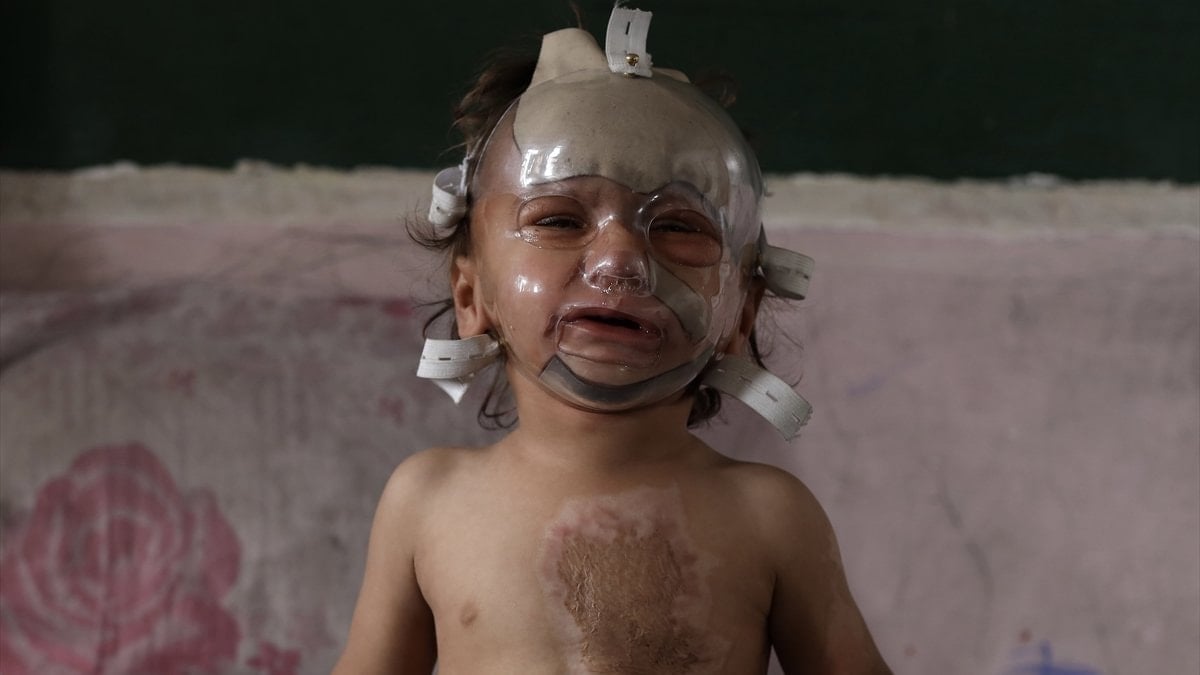 Doktorlar, yanıklara bağlı olarak yüz dokusunun kontrolsüz şekilde genişlemesini önlemek amacıyla çocuğa plastik basınç maskesi taktı.