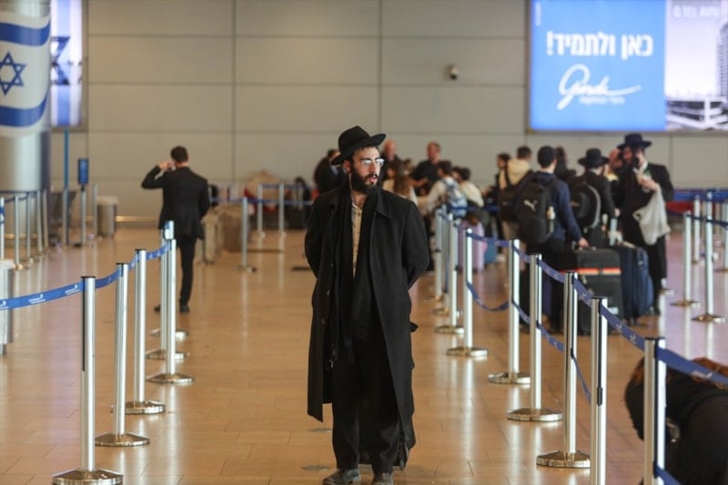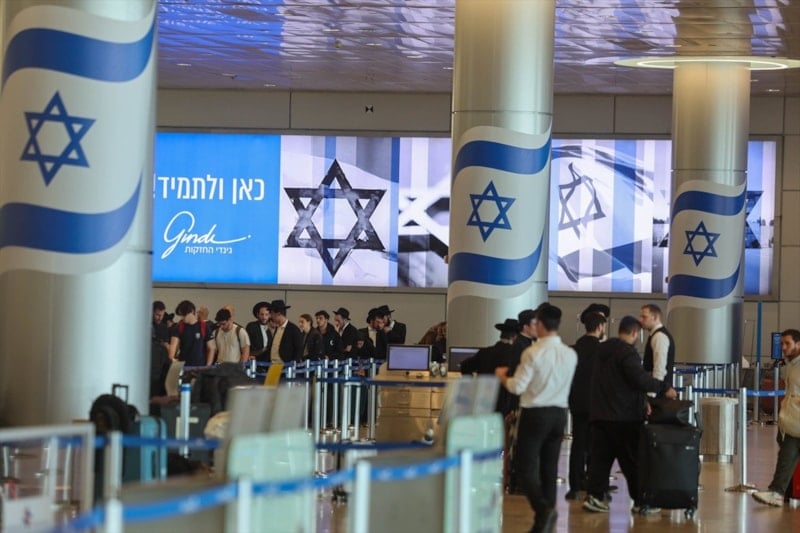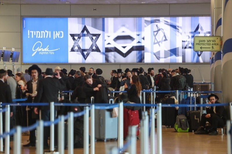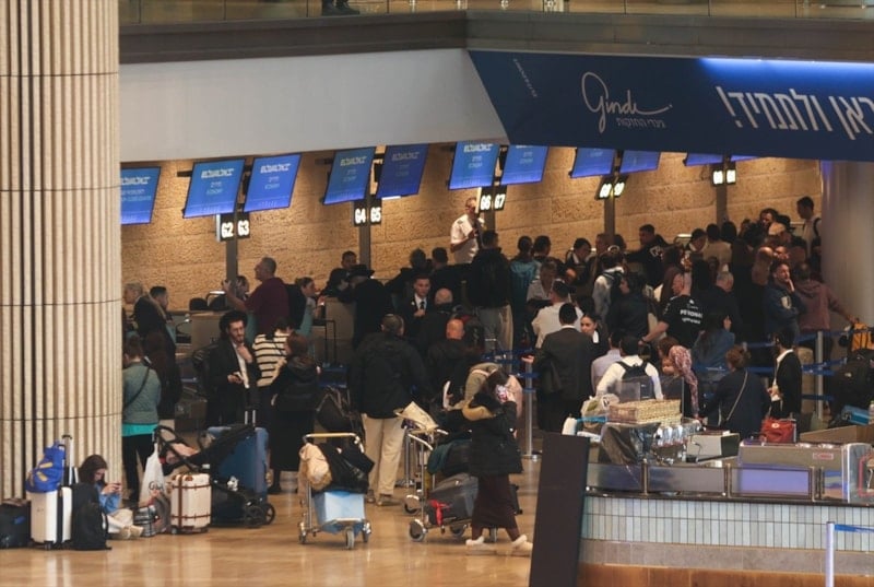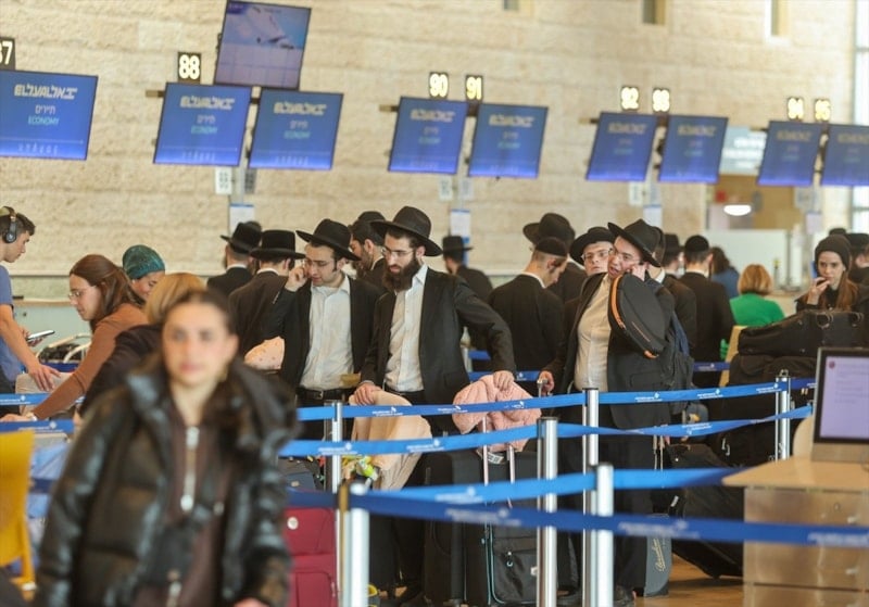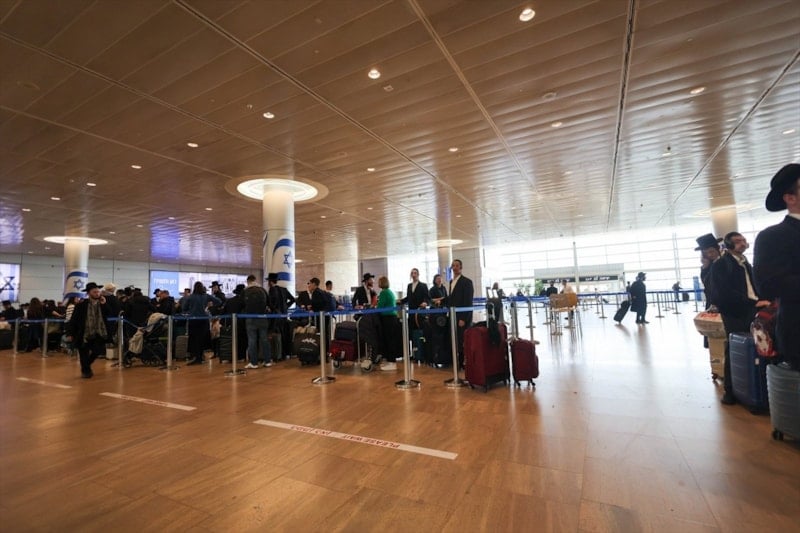 Havalimanında kaydedilen fotoğraflarda İsraillilerin ellerinde bavullarla sıra beklediği görüldü.