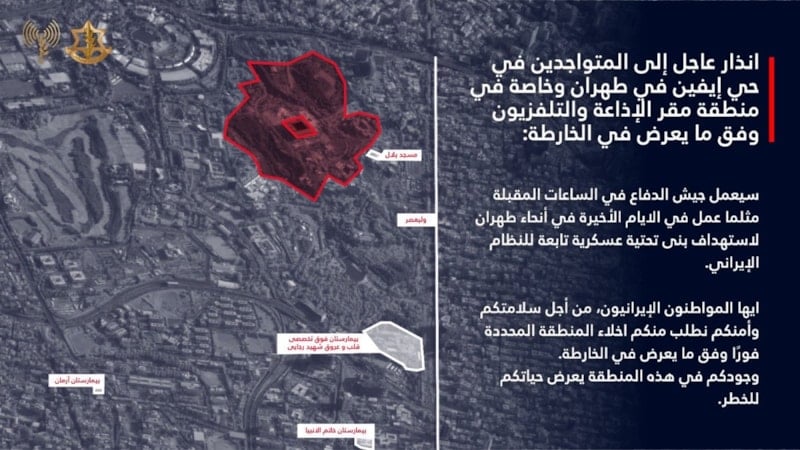 Adraee, Evin semtindeki İran Radyo ve Televizyon Kurumu yerleşkesi çevresinin boşaltılması uyarısında bulunarak kısa bir süre sonra İsrail ordusunun saldırı düzenleyeceği tehdidinde bulundu.