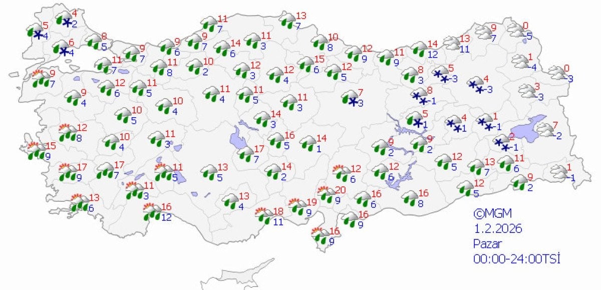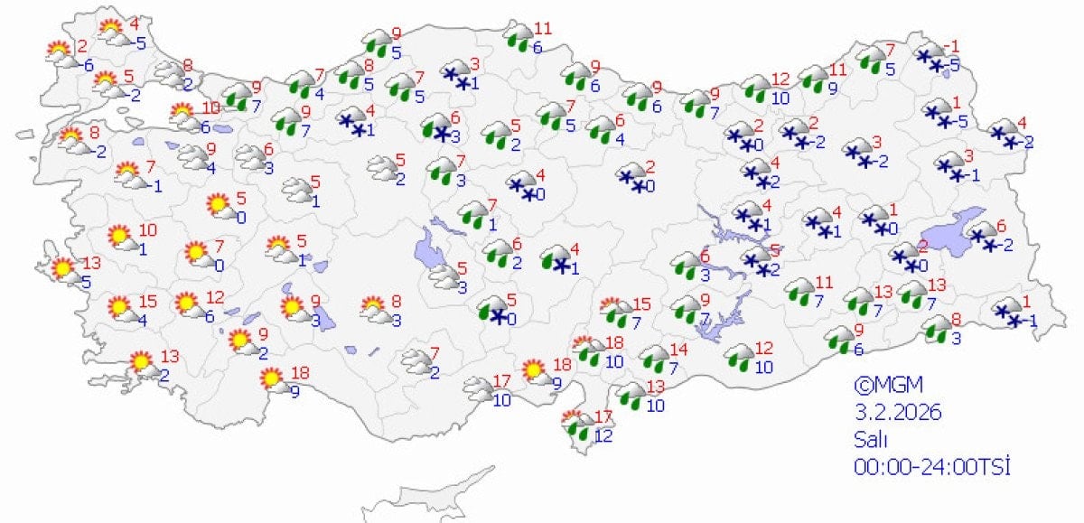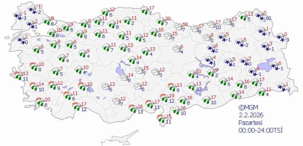 AKOM’un haftalık hava tahmin raporuna göre, 2 Şubat Pazartesi günü karla karışık yağmur, 3 Şubat Salı günü ise kar yağışı bekleniyor.