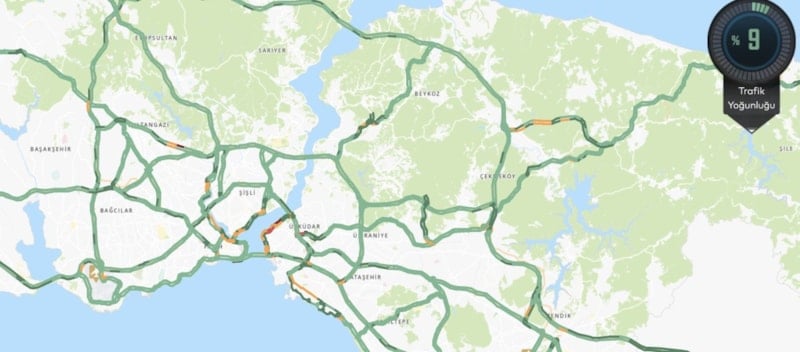 Trafik yoğunluğunun olmaması ve yüzde 9’a düşmesi sonrası İstanbul’da harita tamamen yeşile döndü.