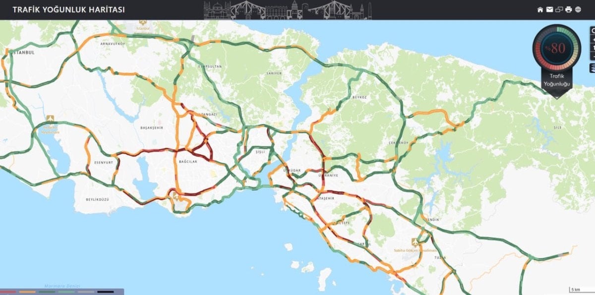 İstanbul Büyükşehir Belediyesinin Cep Trafik Haritası’na göre trafik yoğunluğu saat 08.15 itibarıyla Avrupa Yakası’nda yüzde 78, Anadolu Yakası’nda yüzde 85 ve kent genelinde yüzde 80 olarak ölçüldü.