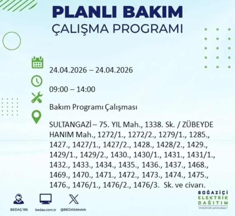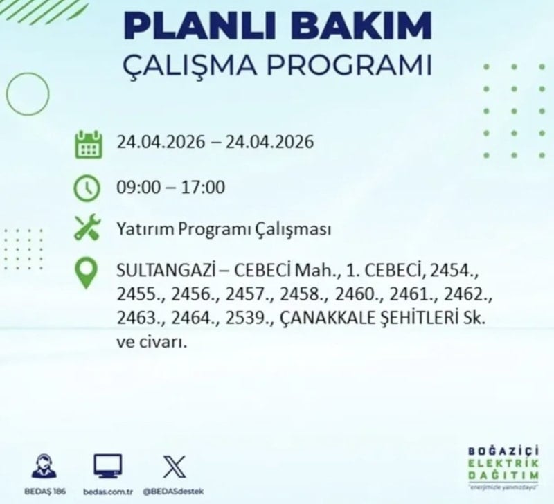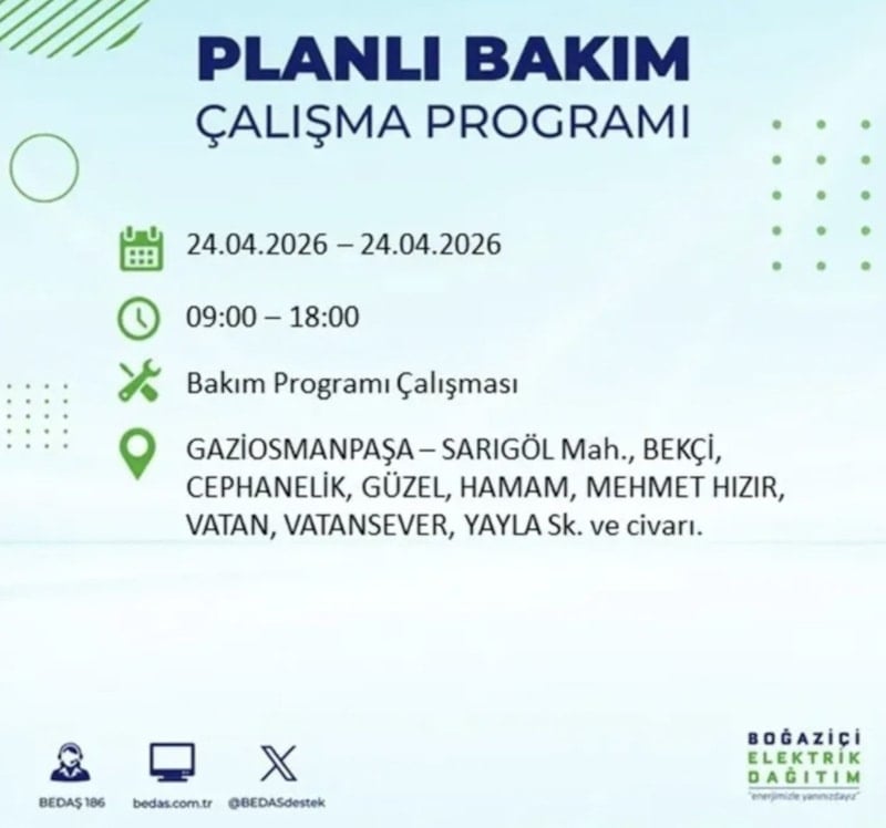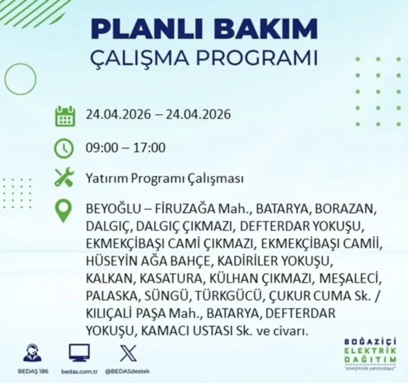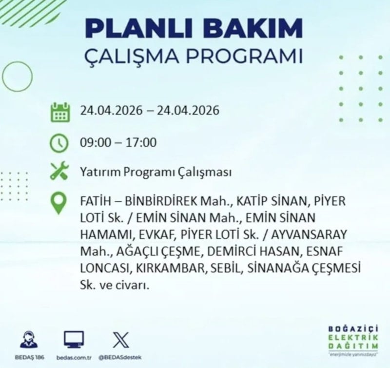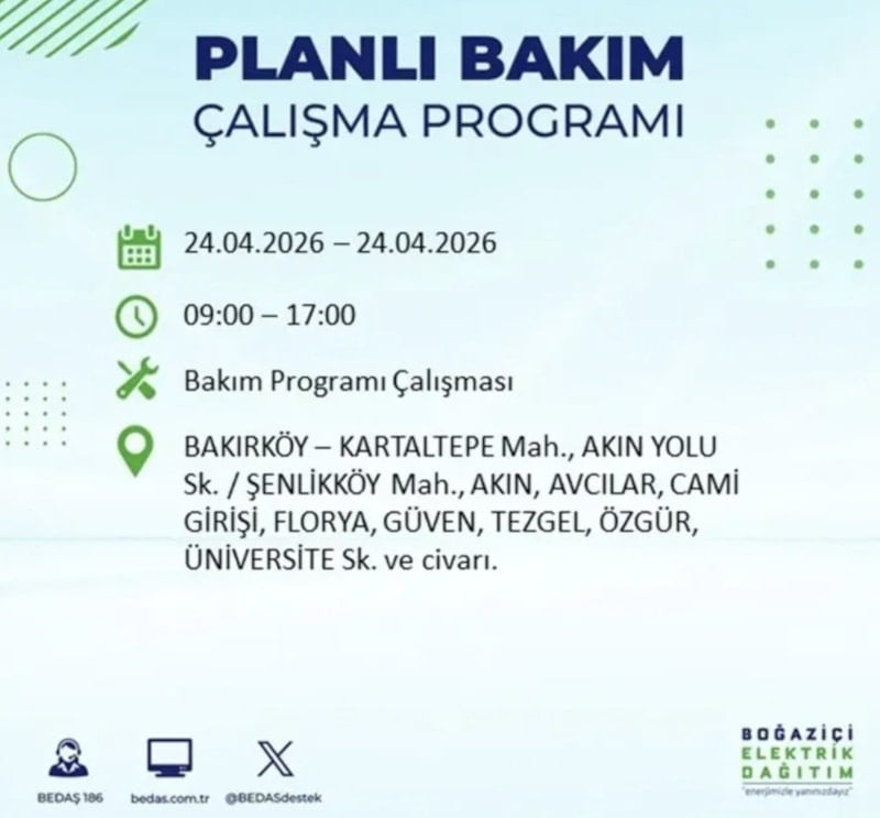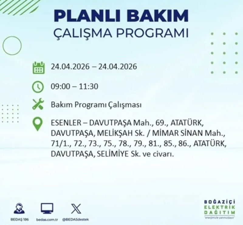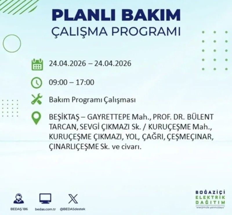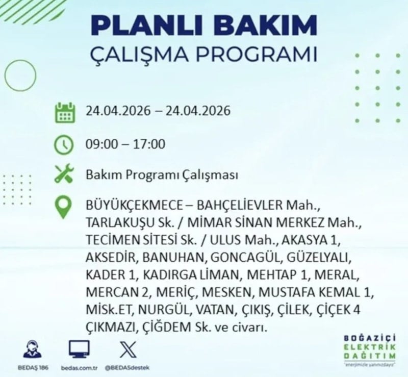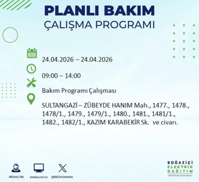 Boğaziçi Elektrik Dağıtım Anonim Şirketi (BEDAŞ) tarafından 24 Nisan tarihli planlı kesinti programı duyuruldu.