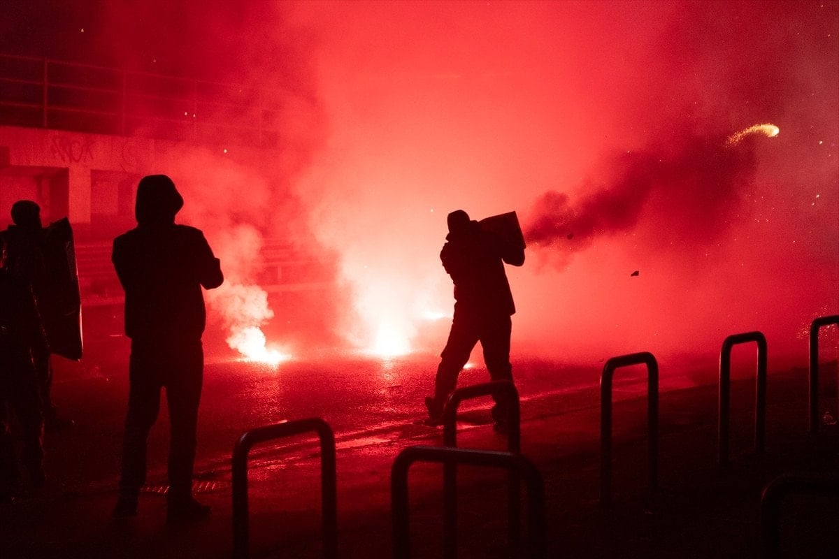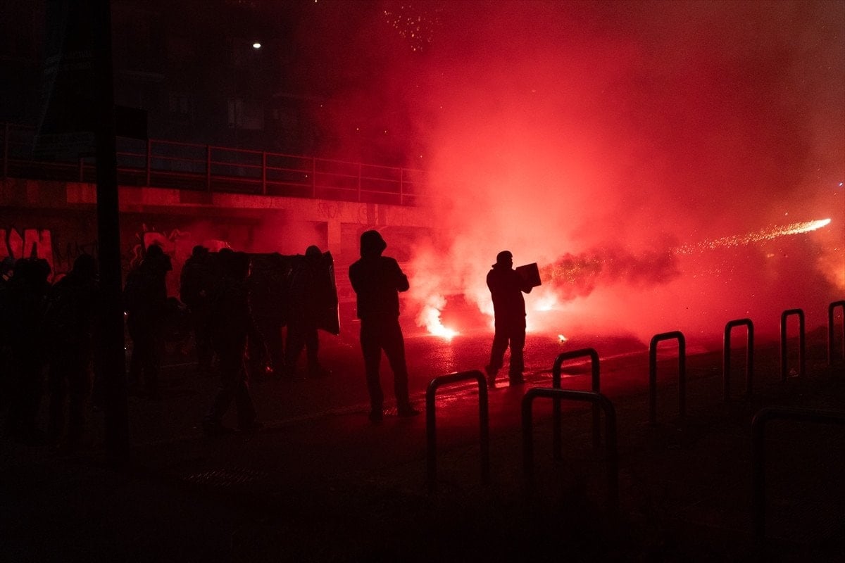 Çok sayıda şişe, havai fişek ve meşale atan protestoculara polis, tazyikli su ve biber gazı sıkarak karşılık verdi.