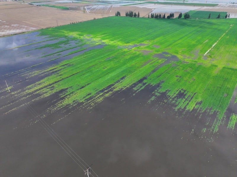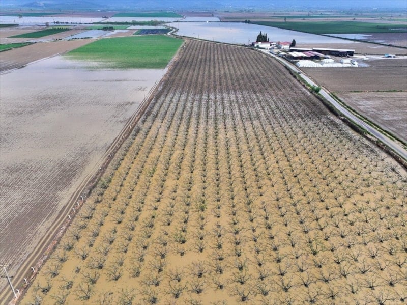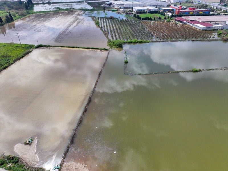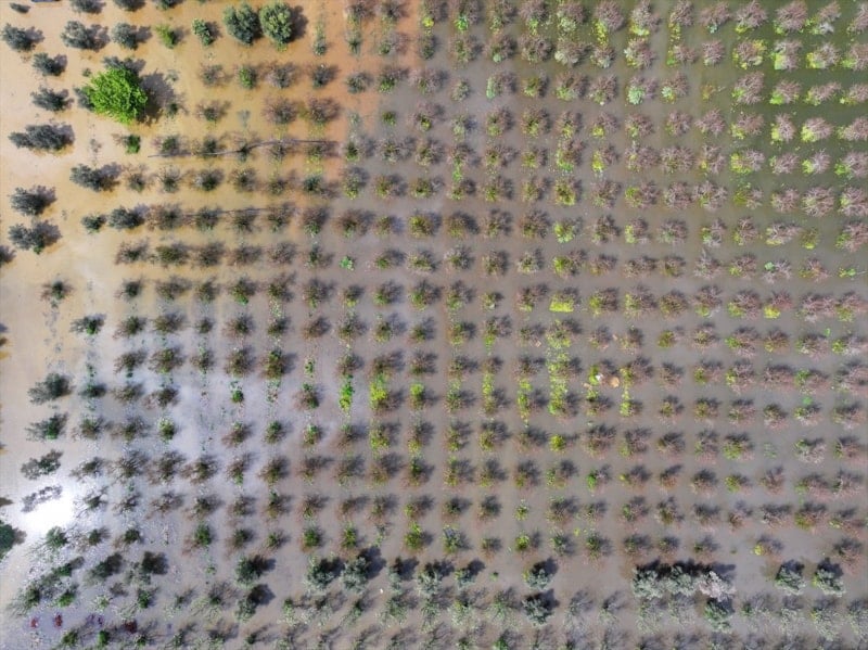 Bölgedeki bazı tarım arazileri ve meyve bahçeleri suyla kaplandı. Su altında kalan alanlar dronla görüntülendi.