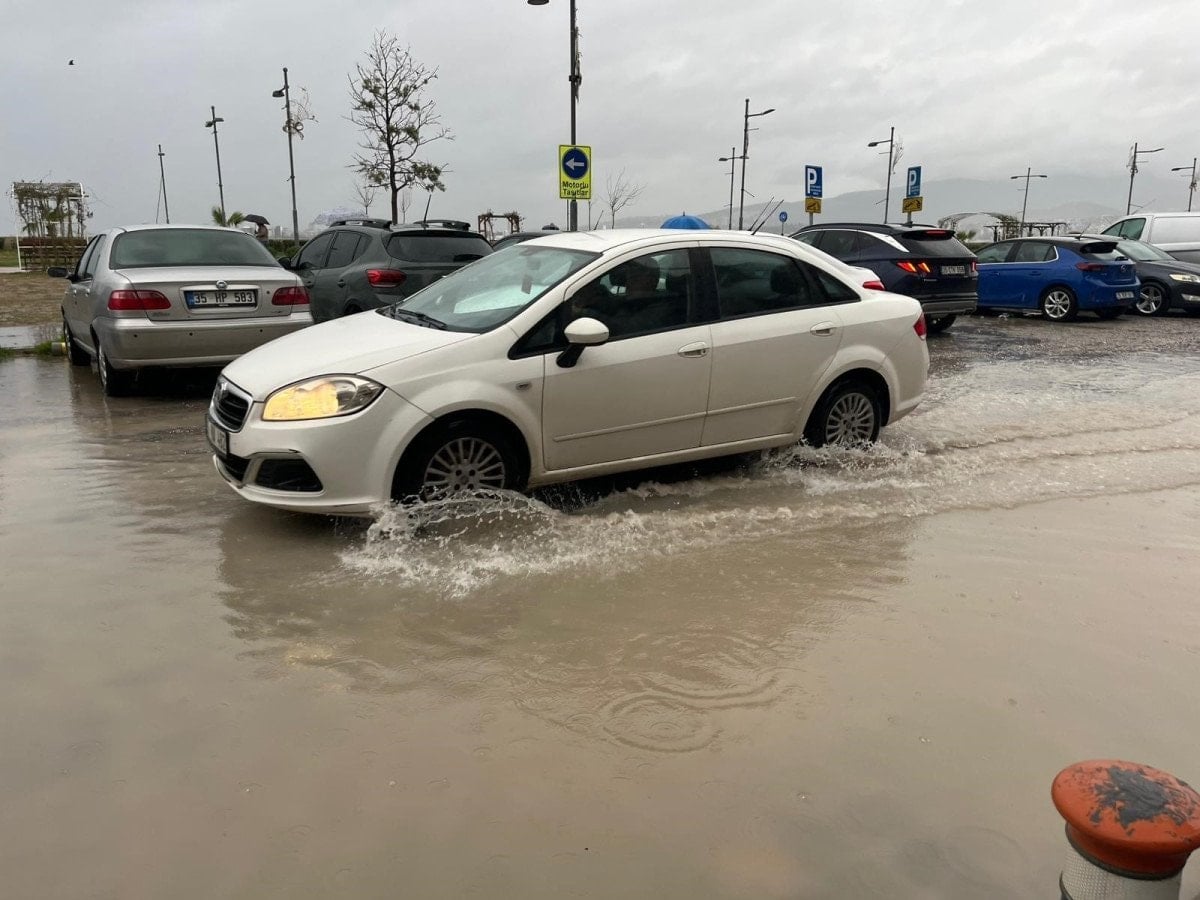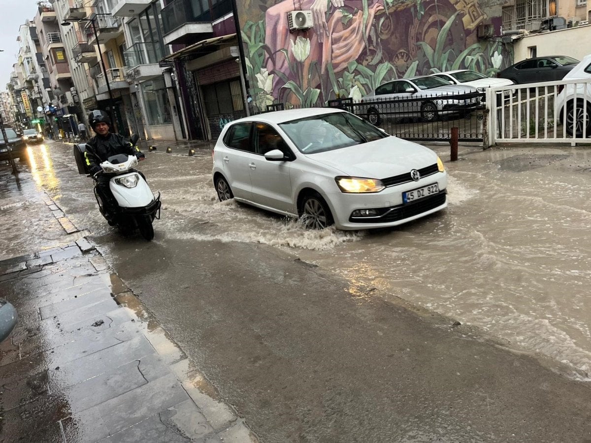 İzmir’de aralıklarla etkisini sürdüren sağanak yağış, Konak ilçesi Alsancak semtinde hayatı olumsuz etkiledi. Altyapı çalışmalarının devam ettiği Kordon ve İkinci Kordon bölgesinde yollar göle döndü.