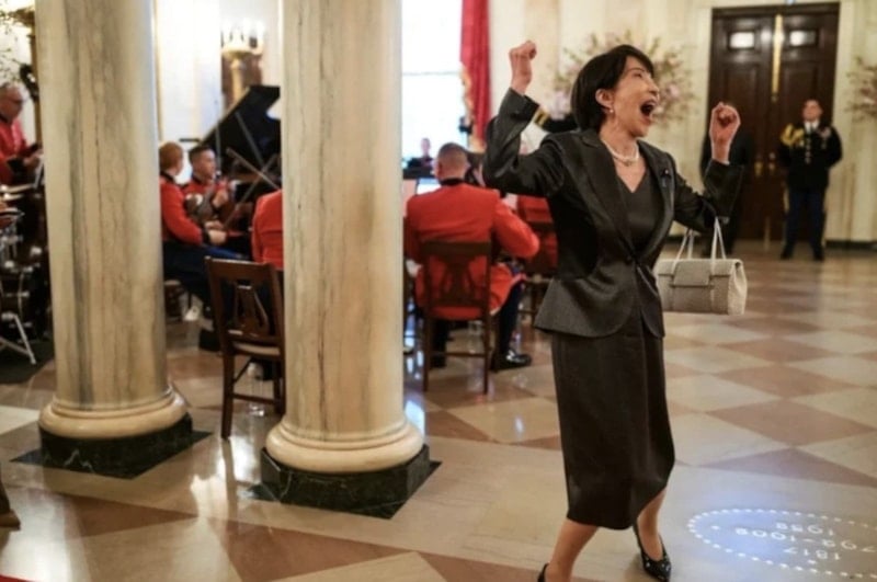 Yaptığı abartılı jest ve mimikler ile ülkesinde de şaşkınlık yaratan Takaiçi, Beyaz Saray’daki akşam yemeğinde de dans ederken kameralara poz verdi.