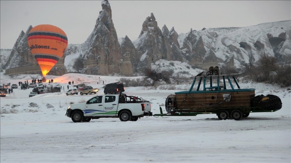 Kapadokya bölgesinde etkili olan kar yağışı, sıcak hava balon uçuşlarını olumsuz etkilemeye devam ediyor.