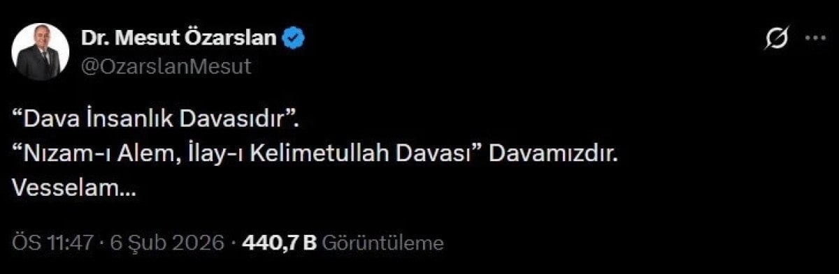 Özarslan paylaşımında “Dava İnsanlık Davasıdır. ‘Nizam-ı Alem, İlay-ı Kelimetullah Davası’ davamızdır. Vesselam…” ifadeleri yer aldı.