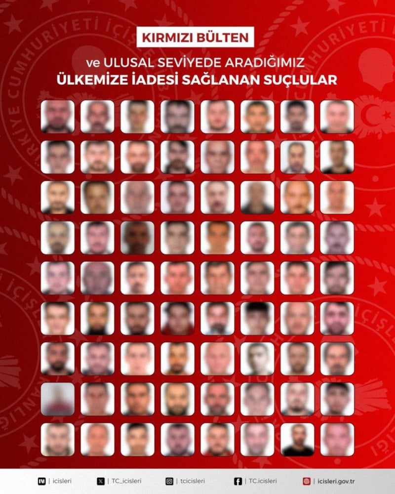 Kırmızı bültenle uluslararası seviyede arananlar (32) H.A., E.U., M.Y., B.A., S.D., E.Ö., B.E., M.Ö., M.K., İ.Ç., O.G., E.Y., Z.İ., M.Y., Ö.Y., İ.K., K.Ç., A.Y., R.Ş., F.M., M.A., Y.Ç., H.İ., S.B., İ.K., A.U., M.Ö., Ş.S.A., R.G., S.E., R.C. ve S.A., ulusal seviyede arananlar (40) A.G., İ.C., F.D., F.Ş., S.C.T., M.T., H.D., R.D., E.T., E.Ö., U.T., S.E., M.Ö., E.U., H.A., B.B., Ş.B., M.Y., E.K., Y.İ., H.B.Y., İ.A., N.Y., Y.K., S.D., F.A., M.K., M.D., D.B., Z.Y., N.D., U.Ö., T.K., E.C.Ö., E.G., E.Y., C.K., C.T., R.S. ve U.Ö. isimli şahıslar yakalandı ve ülkemize iadeleri sağlandı.