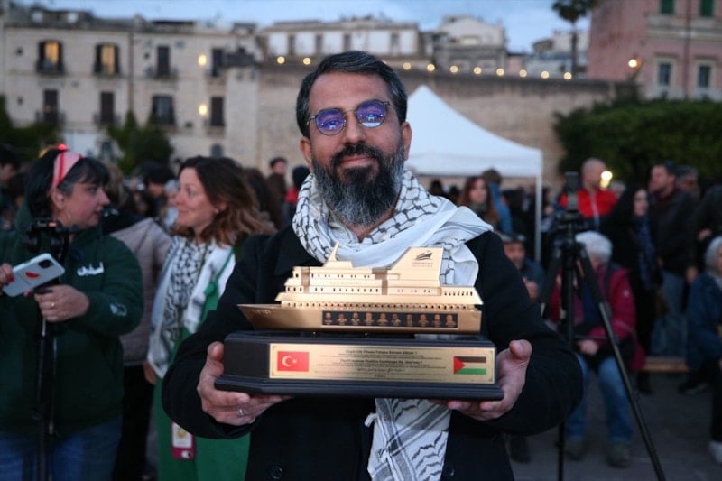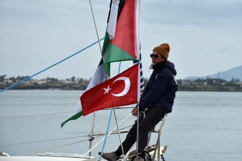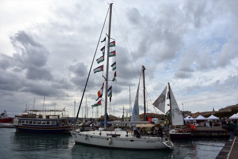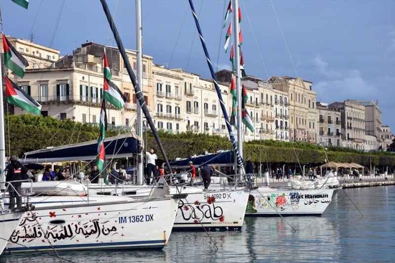 Filistin bayrakları ve sembolleriyle donatılan tekneler, Siracusa Limanı’na girişlerinde destekçiler tarafından karşılandı. Sahilde toplanan kalabalık, “Özgür Filistin” sloganlarıyla filoya destek verdi.
