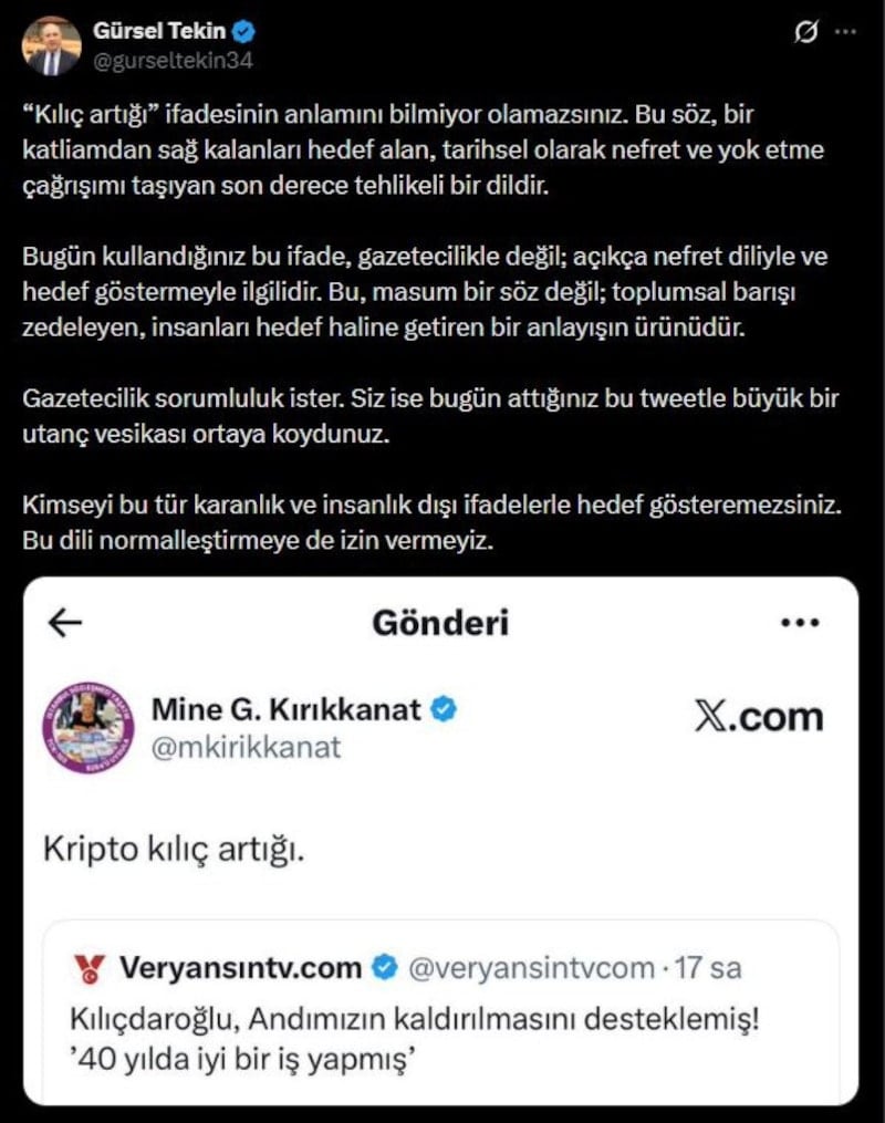 CHP’nin eski İstanbul milletvekili Gürsel Tekin de tartışmaya ortak olarak, Mine Kırıkkanat’ın paylaşımının kasıtlı olduğu imasında bulunarak, ““Kılıç artığı” ifadesinin anlamını bilmiyor olamazsınız. Bu söz, bir katliamdan sağ kalanları hedef alan, tarihsel olarak nefret ve yok etme çağrışımı taşıyan son derece tehlikeli bir dildir.” dedi.