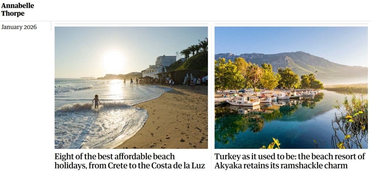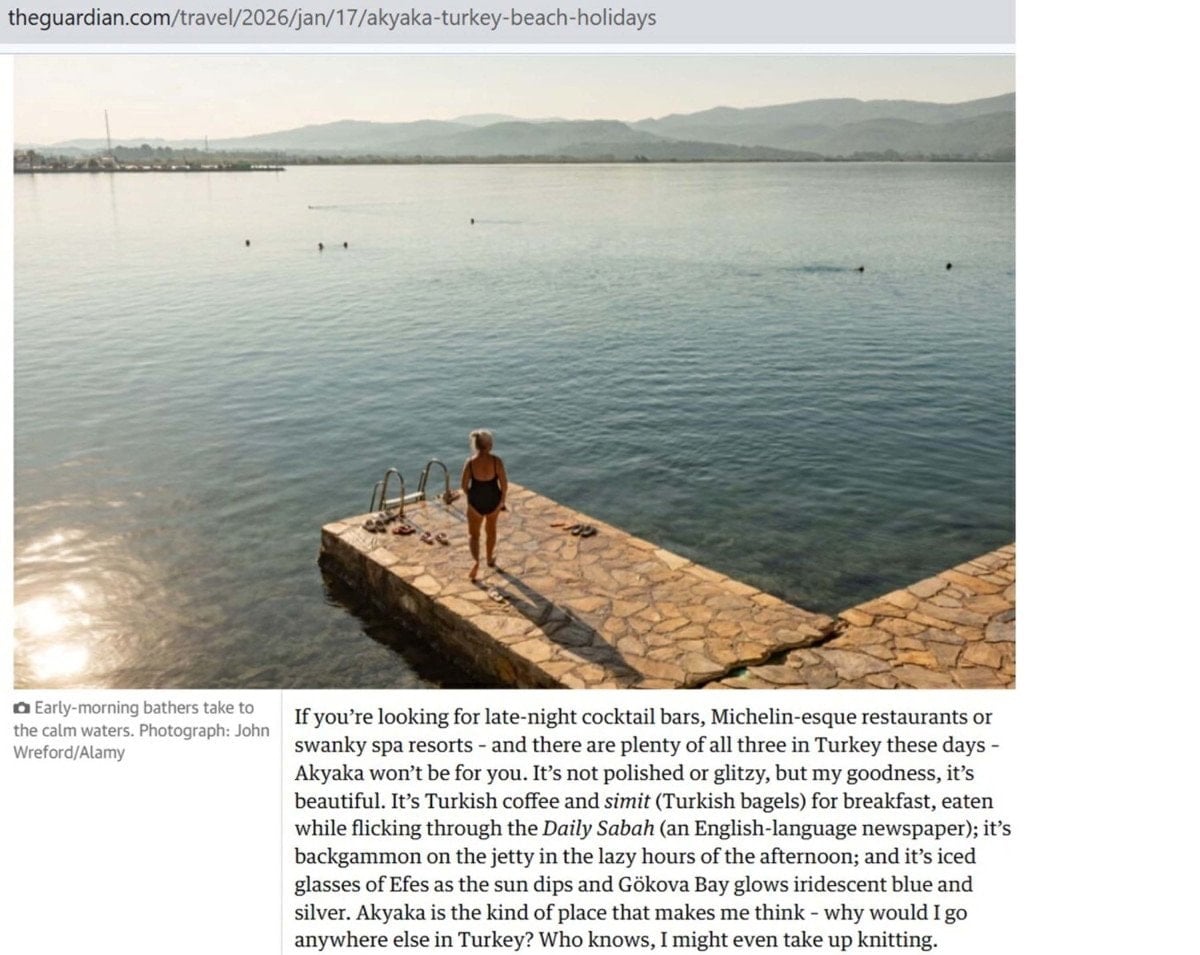 Thorpe, Akyaka’nın hala gerçek bir tatil hissi sunduğunu vurgularken, son ziyaretinde yaşadığı bir anın kasabanın ruhunu özetlediğini, gün batımında plajda şezlongların toplanması, restoranların akşam servisine hazırlanması ve sahilde örgü ören üç Türk kadının görüntüsünü, ‘Tam olarak olmak istediğim yer burası’ olarak anlattı.