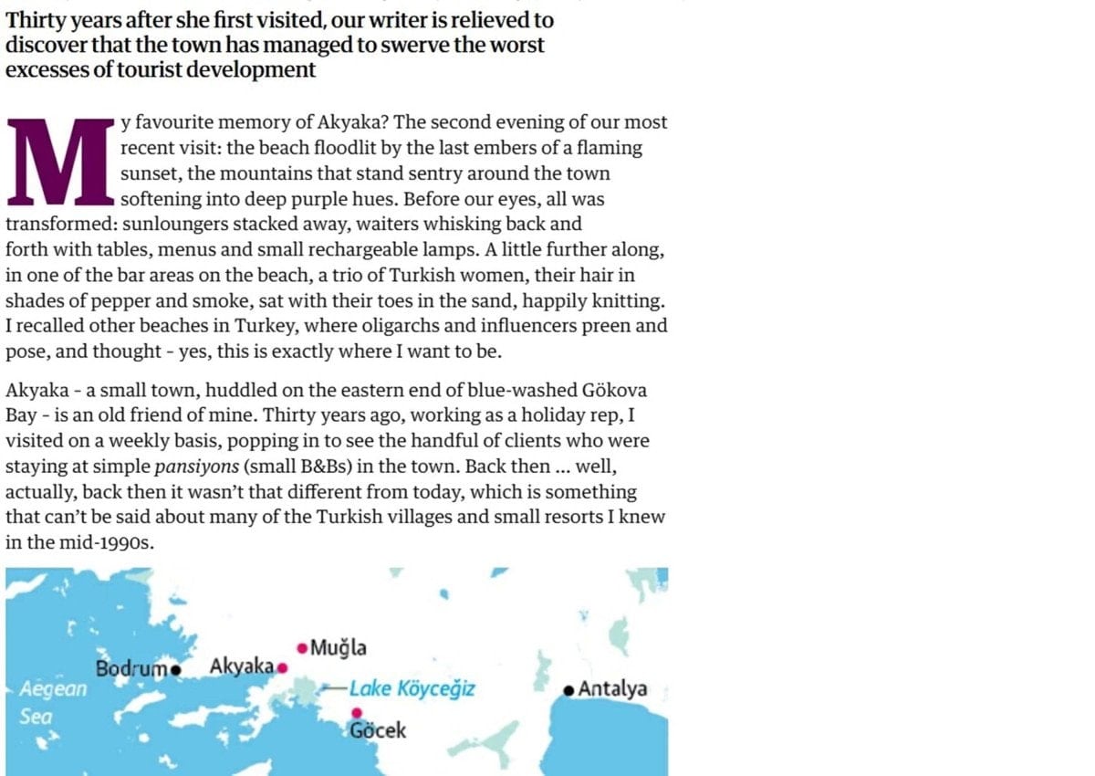 İngiliz The Guardian’da köşe yazarı Annabelle Thorpe, kaleme aldığı yazısında Akyaka Mahallesi’ni, gösterişten uzak yapısı, yavaş yaşam temposu ve doğayla kurduğu güçlü bağ sayesinde kitlesel turizme direnen ender sahil kasabalarından biri olarak tanımladı.