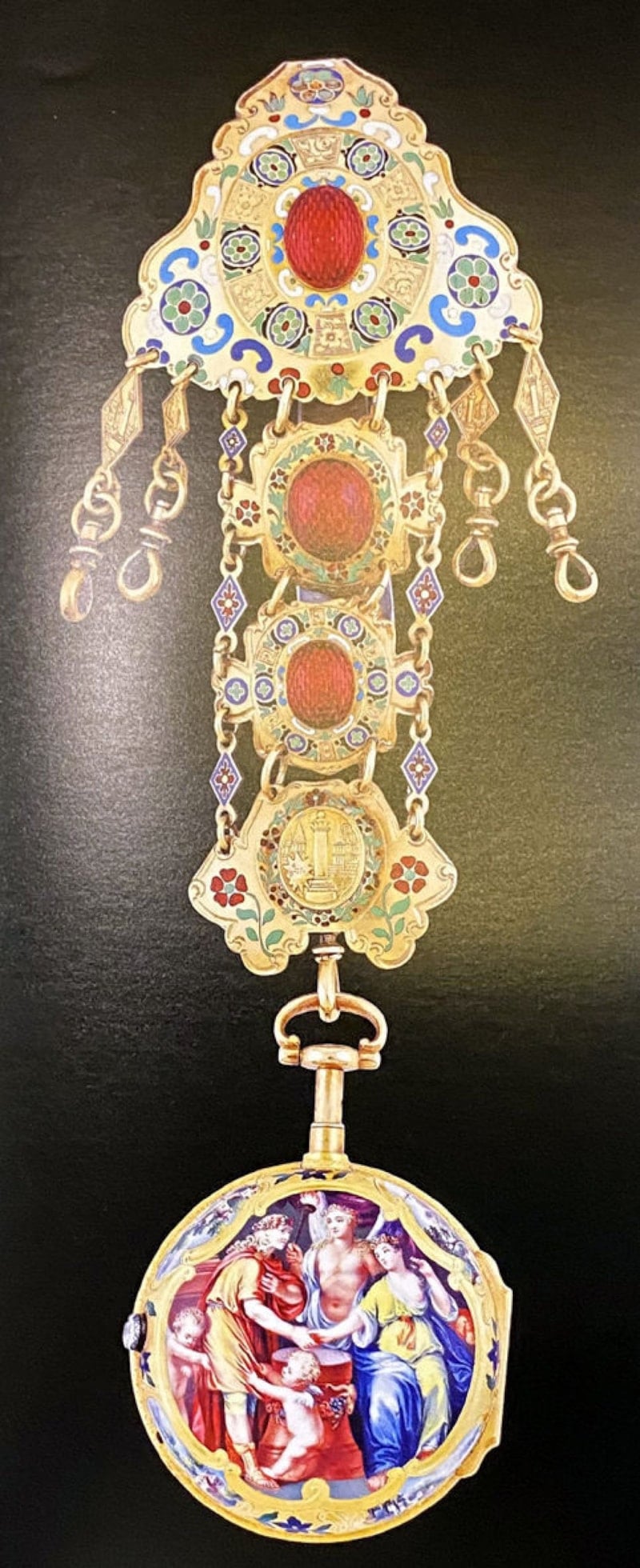 (Mehmet Çebi’nin koleksiyonunda yeralan, iri bir mücevheri andıran, üzerinde envaî taşların bulunduğu ve hanımlar için yapılmış nisbeten daha küçük boyutlardaki saatlerden biri)