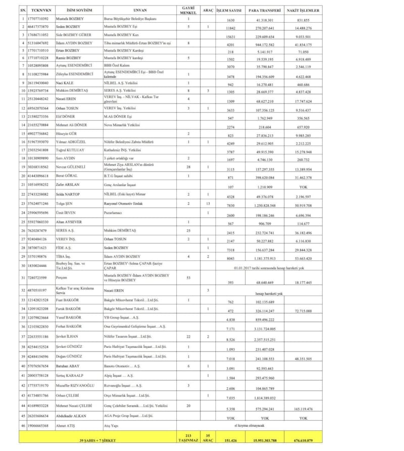Başkan Mustafa Bozbey’in merkezinde olduğu suç örgütüne yönelik yapılan MASAK tarafından yapılan araştırma sonucu yapılan tespitlerde 39 şahıs ve 7 şirketin üzerine kayıtlı suça konu edilen 213 taşınmaz ile 35 araç bulunduğu ve suça konu işlem hacminin toplam 15 milyar 951 milyon TL’yi bulduğu öğrenildi.