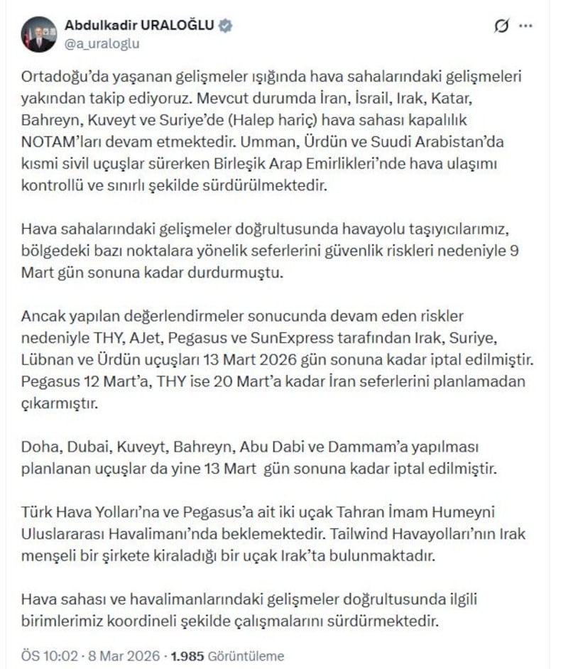 Bakan Uraloğlu’nun verdiği bilgilere göre, Doha, Dubai, Kuveyt, Bahreyn, Abu Dabi ve Dammam uçuşları da 13 Mart gün sonuna kadar iptal edildi.