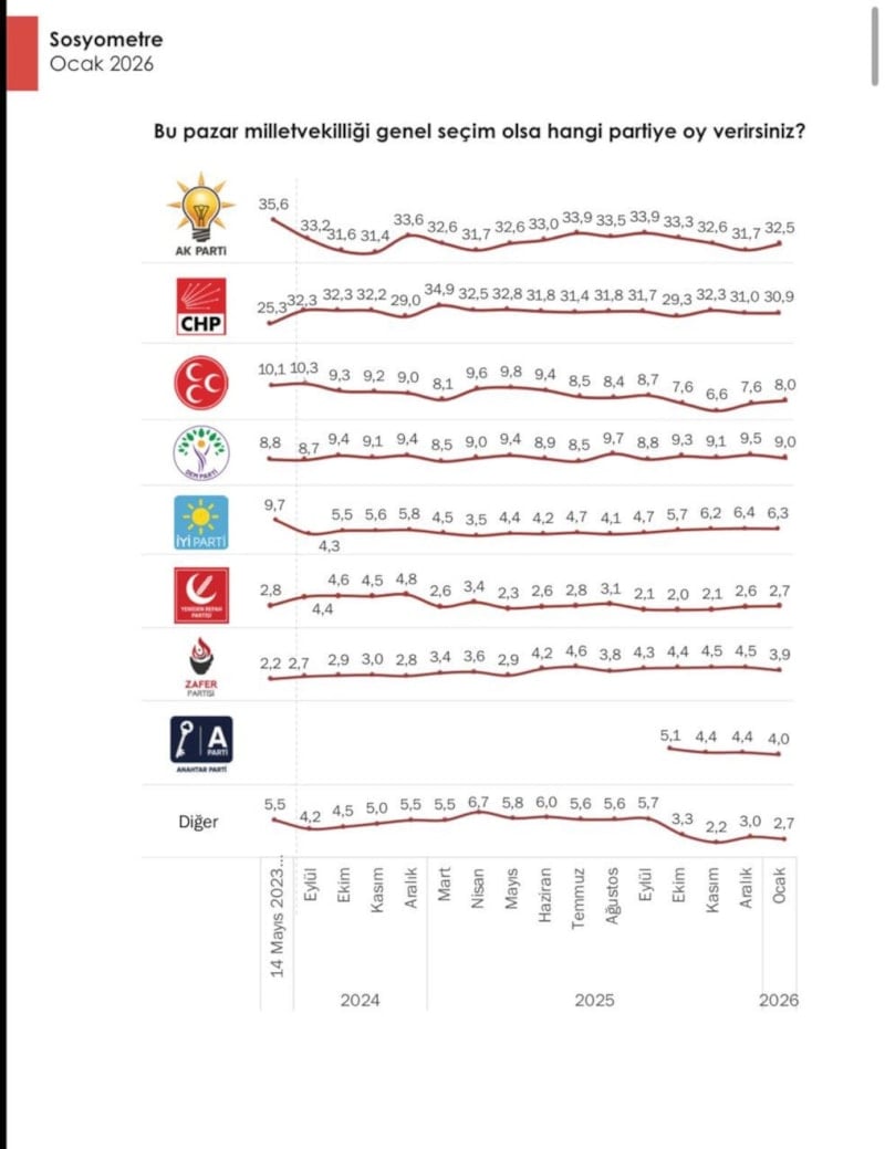 AREDA Survey’in Ocak 2026 verilerine göre AK Parti’nin oy oranı yüzde 32,5, CHP’nin oy oranı ise yüzde 30,9 olarak ölçüldü.