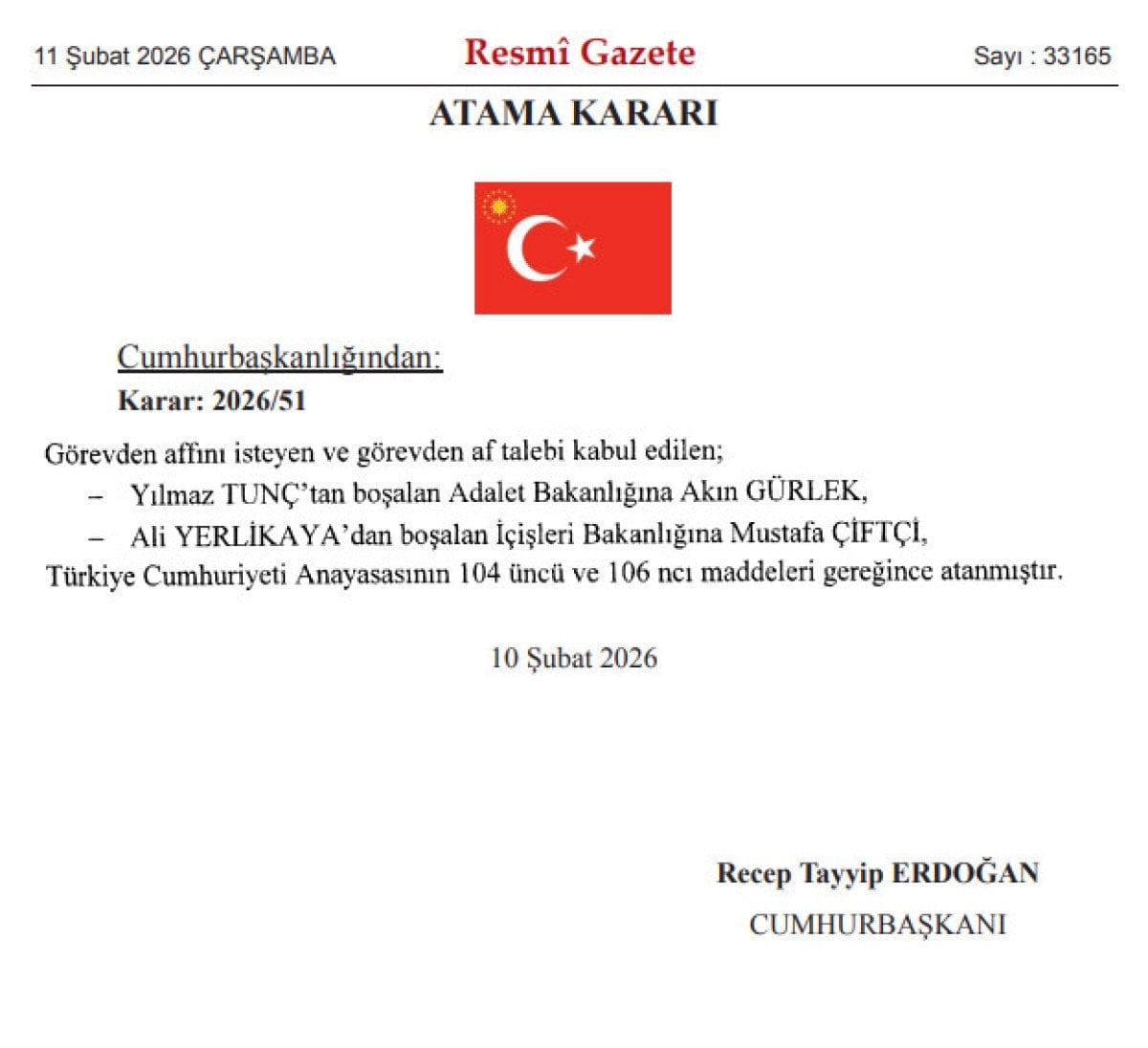 –– Cumhurbaşkanlığı Tarafından Yapılan Atama Hakkında Karar (Karar: 2026/51)