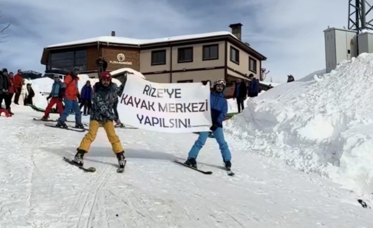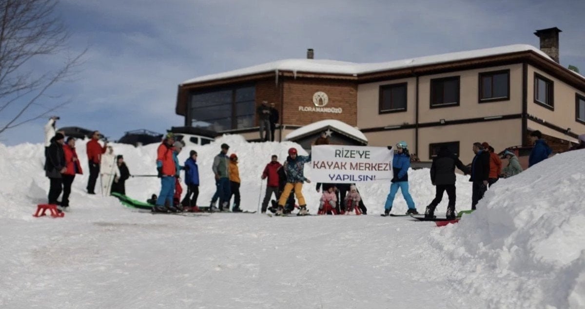 Vatandaşlar, “Rize’ye kayak merkezi yapılsın” yazılı pankartlar açarak taleplerini dile getiriyor.
