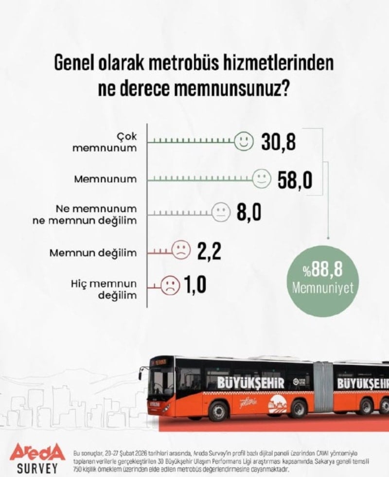 Sakarya, ikinci metrobüs kenti olmanın sevincini yaşarken anketler de Sakarya Büyükşehir Belediyesi’nin hizmetine ilişkin memnuniyeti ortaya koyuyor.