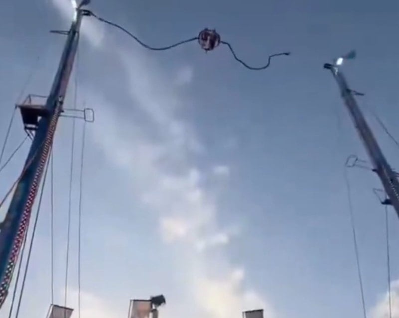 Oyuncağın kapsülünü taşıyan halatlardan biri aniden koptu. Dengeyi kaybeden kapsül, yüksek hızla savrularak destek direğine çarptı ve ardından havada asılı kaldı.
