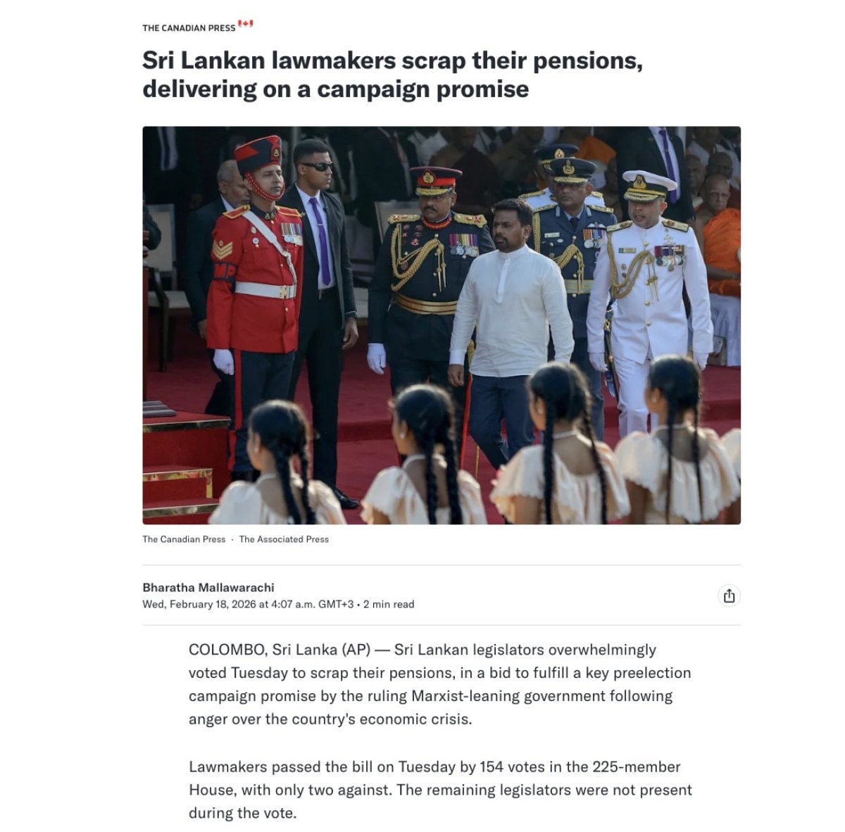 Sri Lanka’da, bir milletvekili daha önce 5 yıllık görev süresinin ardından emekli maaşı almaya hak kazanıyordu. Yeni yasa, halihazırda emekli maaşı alan veya almaya hak kazanan herkese ödeme yapılmasını durduruyor. 2024’te göreve gelen Cumhurbaşkanı Anura Kumara Dissanayake, seçim kampanyası sırasında bu uygulamaya son vereceğine söz vermişti.
