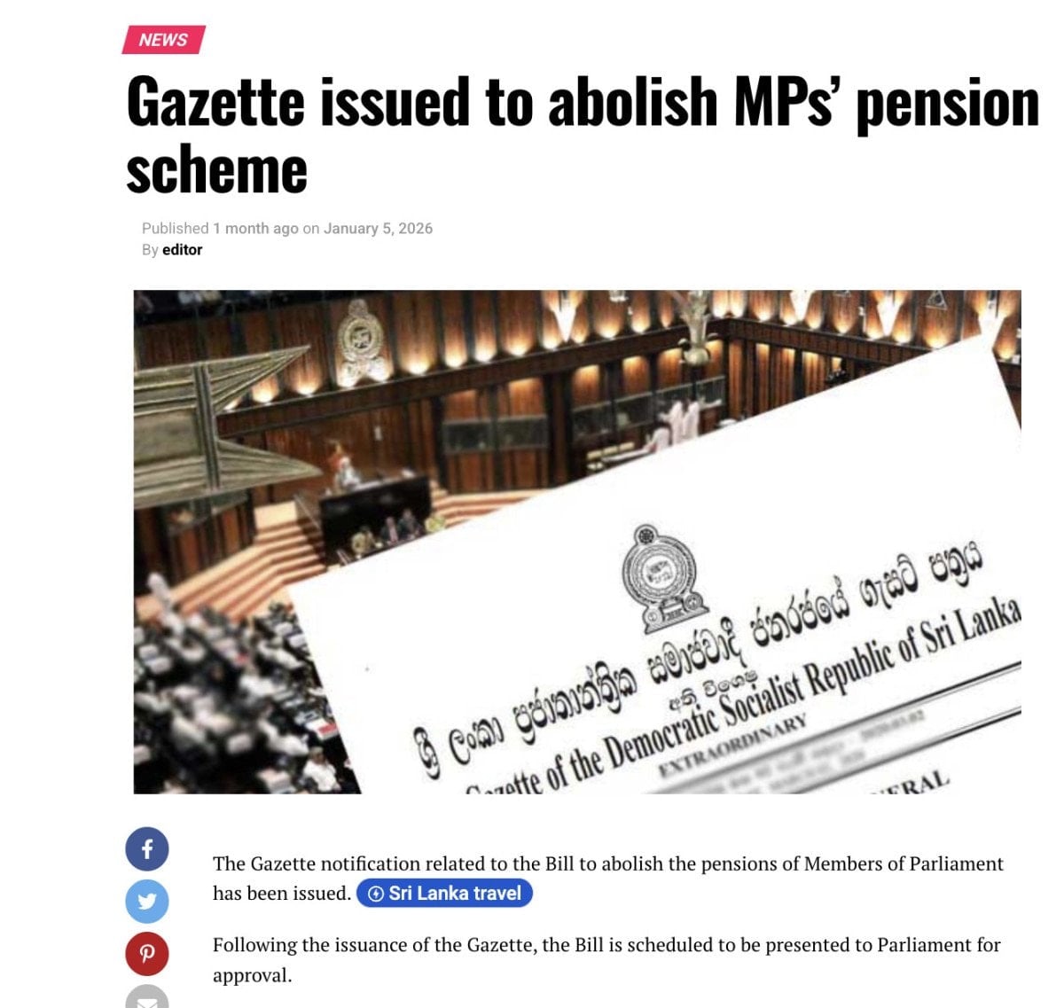 Güney Asya’da bir ada ülkesi olan Sri Lanka yani resmi adıyla Sri Lanka Demokratik Sosyalist Cumhuriyeti, eski adıyla Seylan, emekli milletvekili maaşlarını kaldıran ilk ülke olarak tarihe geçti.